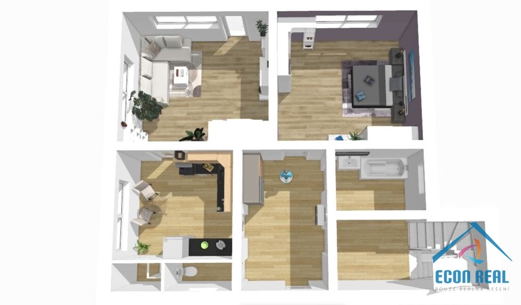 Rekonstrukce: Oba byt zcela nové. U domu byla zateplena vstupní část domu a je možné toto zateplení provést i v přední a boční části.