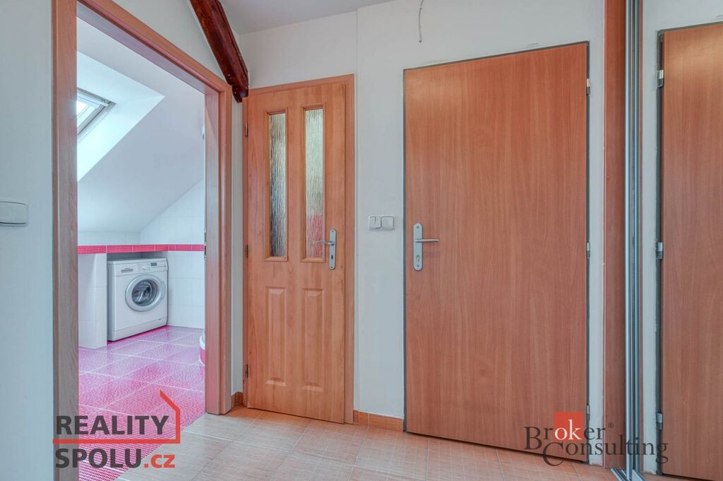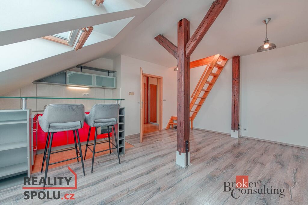 Byt prošel kompletní rekonstrukcí a je částečně vybavený. V dolním patře se nachází moderní kuchyňská linka s barovým pultem a dostatkem prostoru pro obývací část. Koupelna je vybavena sprchovým koutem, toaleta je oddělena a k dispozici zůstává také pračka. V předsíni naleznete velkou vestavěnou skříň, v ložnici v horním patře pak další úložné prostory. Komfort zajišťuje klimatizační jednotka.