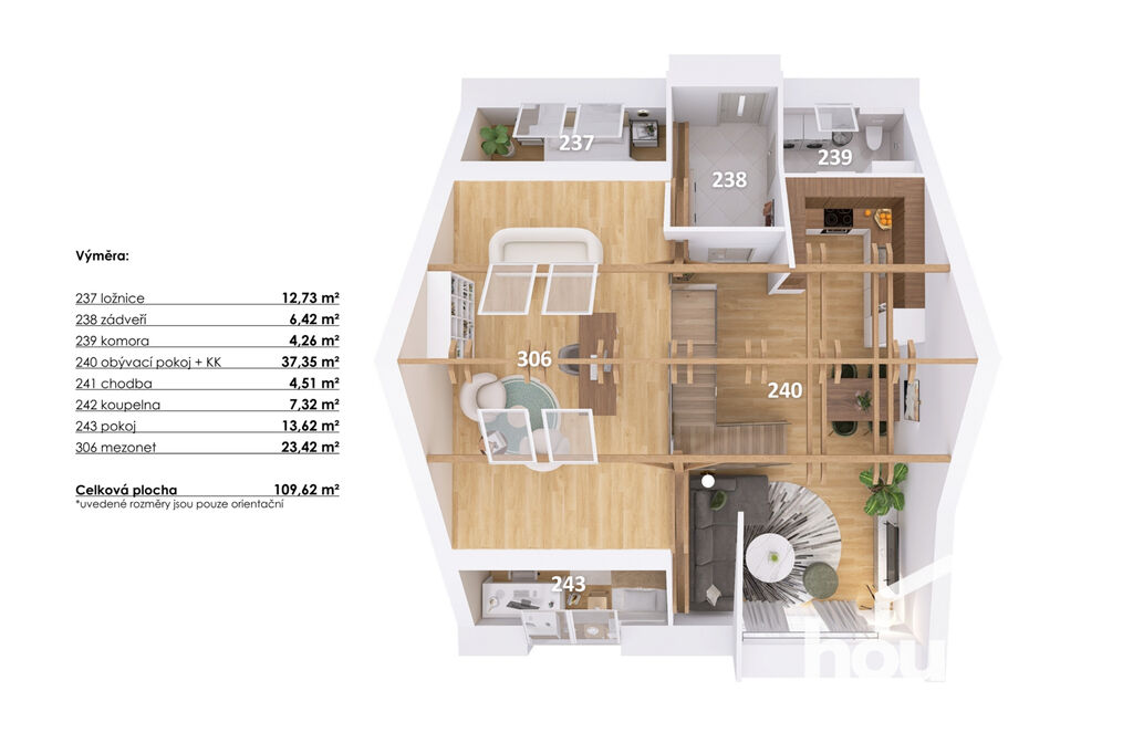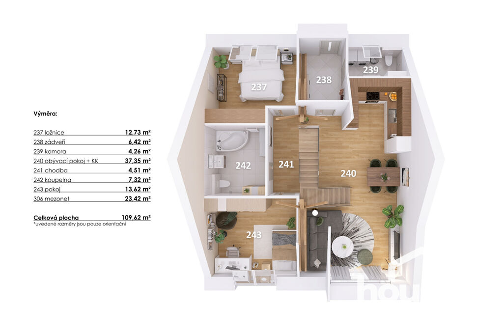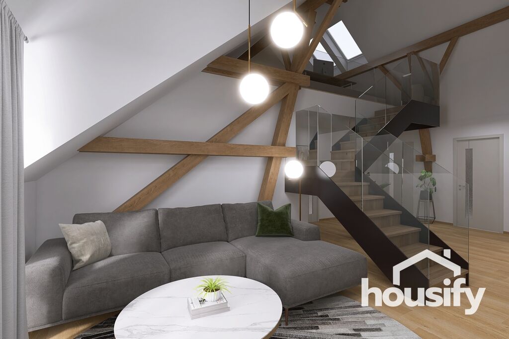 Hlavní obytná část o rozloze 42 m² spojuje otevřený mezonet, obývací pokoj a kuchyňský kout. Výjimečnou atmosféru tohoto prostoru vytváří kombinace minimalistických detailů, industriálního kovového schodiště a hřejivosti přírodních materiálů, jako jsou dřevěné trámy. Pečlivé propojení těchto prvků dodává interiéru nezaměnitelný charakter. Další komfort zajistí dvě samostatné ložnice a dvě koupelny s toaletou.