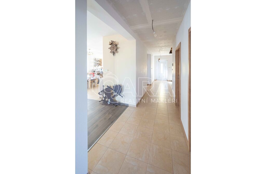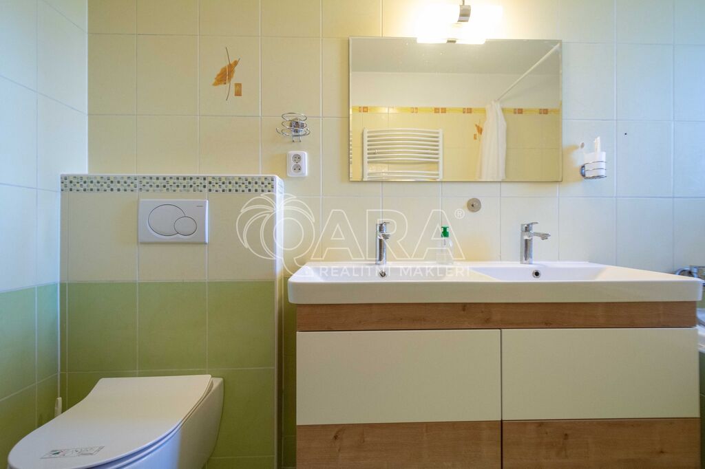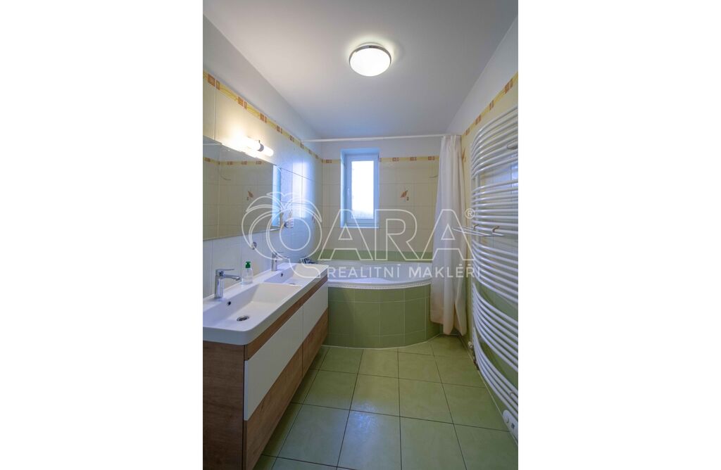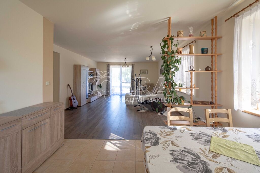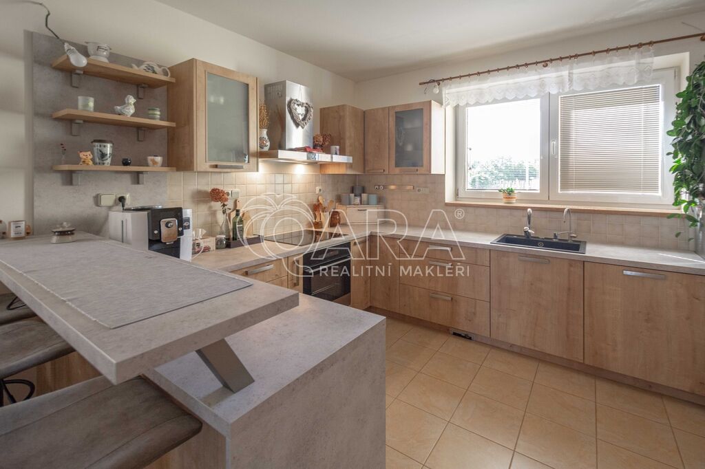 • Na podlaze kombinace dlažby a plovoucí podlahy. Kuchyňská linka včetně vestavných spotřebičů: el. trouba s indukční deskou, digestoř, myčka.