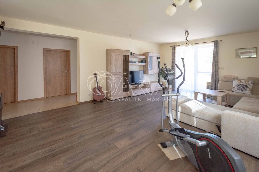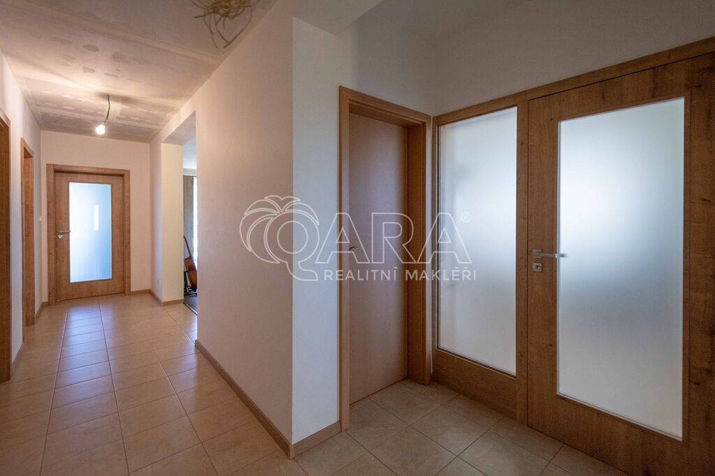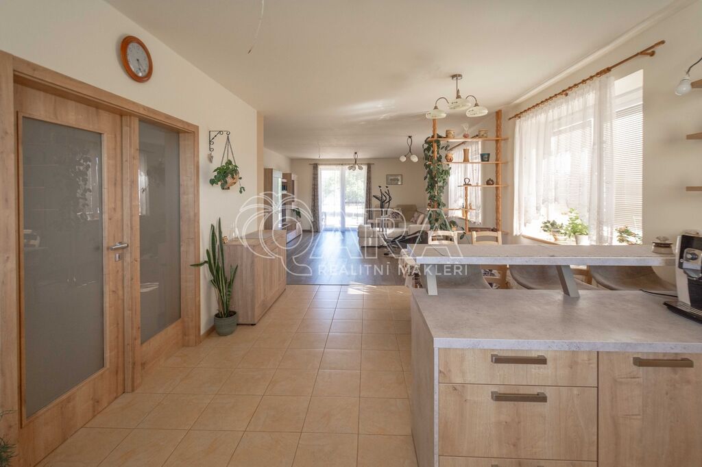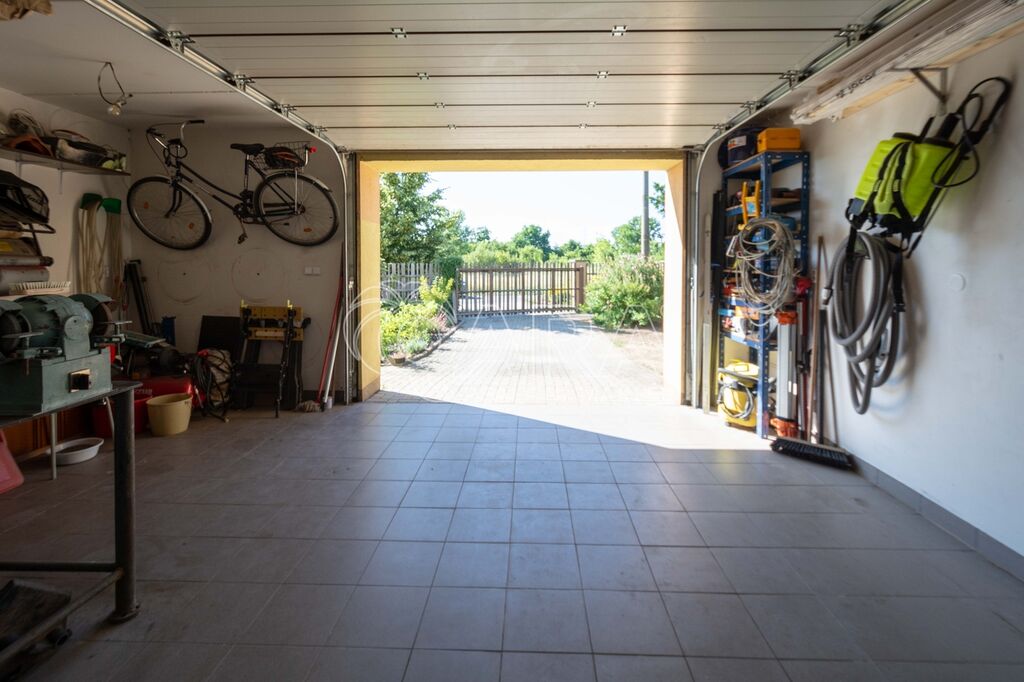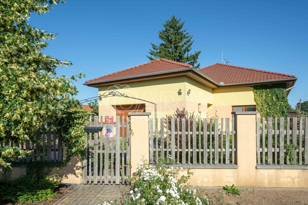 Dispozice přízemí o celkové vnitřní ploše 147,9 m2 + terasa o velikosti 27,6 m2: vstupní hala, chodba, kuchyň spojená s jídelnou, obývacím pokojem a vstupem na terasu, spíž, ložnice s vestavnou skříní a vstupem na terasu, dva menší pokoje, koupelna s vanou a WC, samostatné WC, technická místnost a garáž. Oplocená zahrada s brankou a vjezdovou bránou.