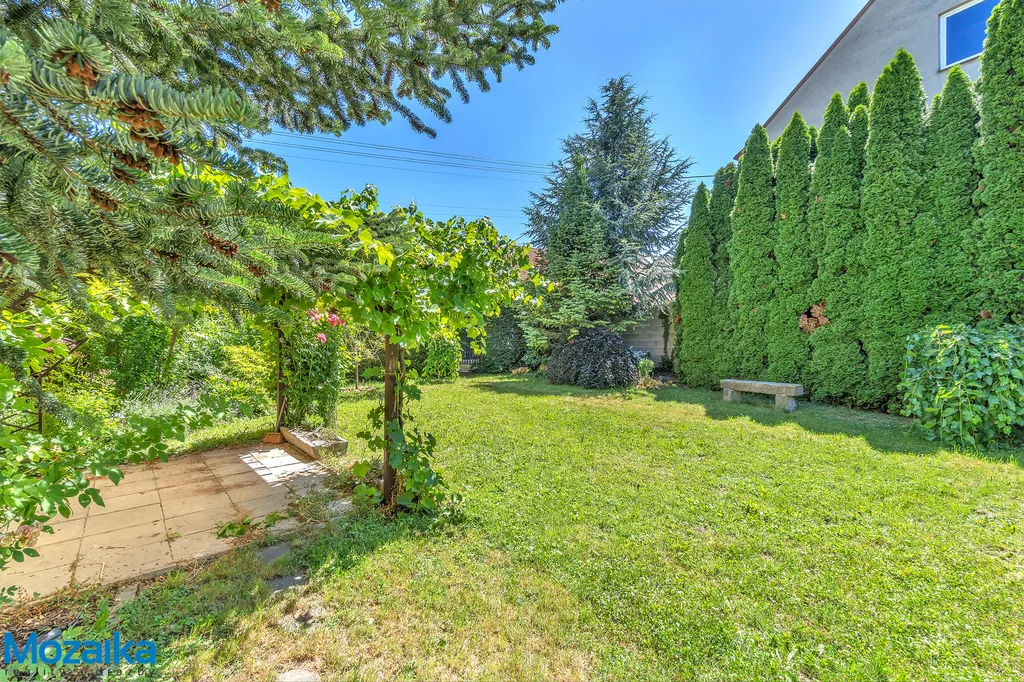 Za domem se nachází dlážděný dvorek s krytým posezením, králíkárnou a zapuštěným bazénem s pískovou filtrací (2 × 3 m, hloubka 80 cm). Odtud vstoupíte do dechberoucí zahrady, která je díky zdem a zeleným stěnám naprostým soukromým útočištěm.