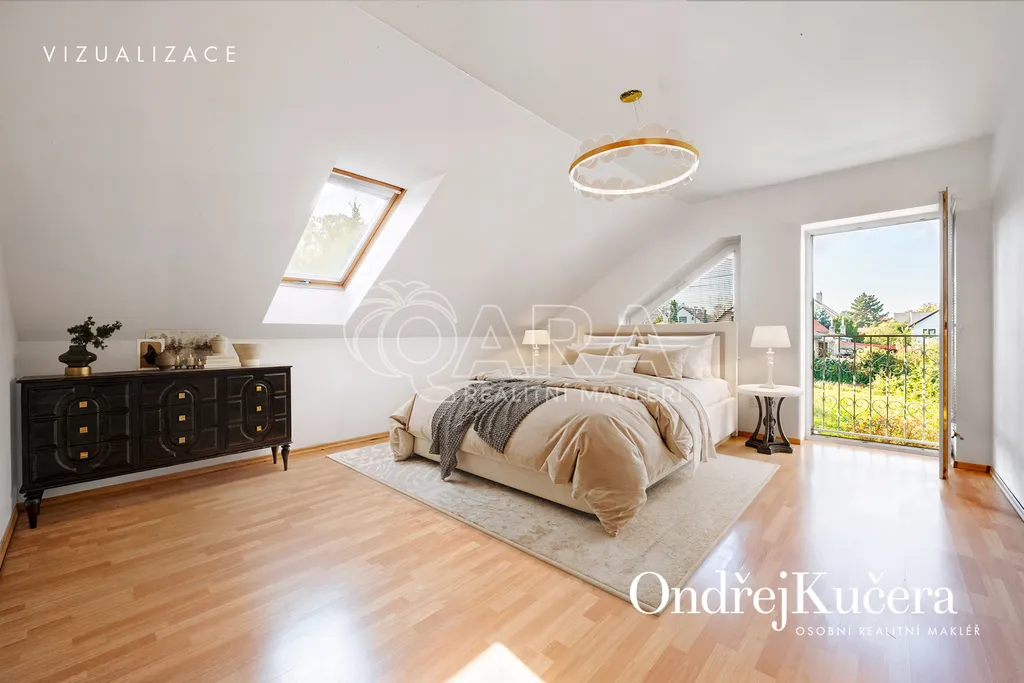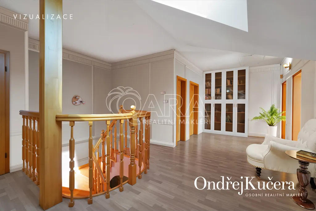 - Chytré členění: klidová zóna s ložnicemi, pracovnou, pokojem pro hosty či fitness je umístěna v patře. Hlavní ložnice má vlastní šatnu, koupelnu a balkon.