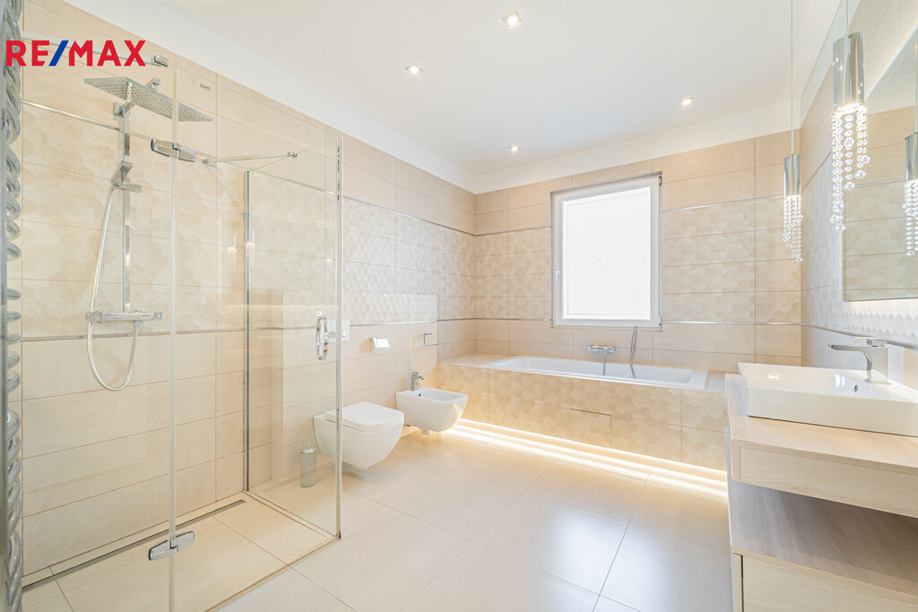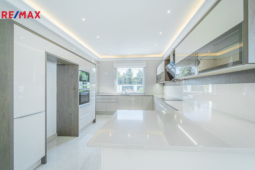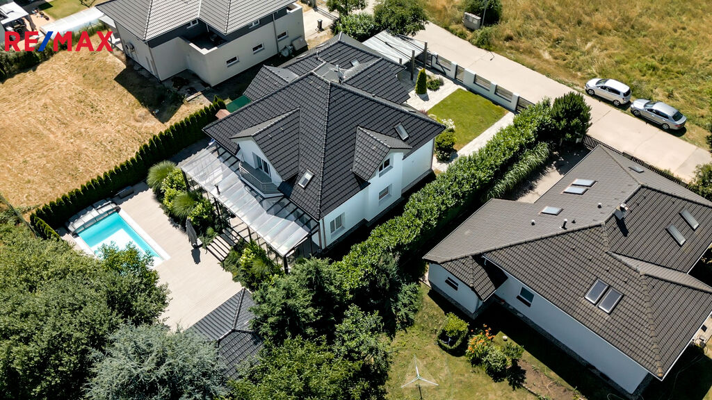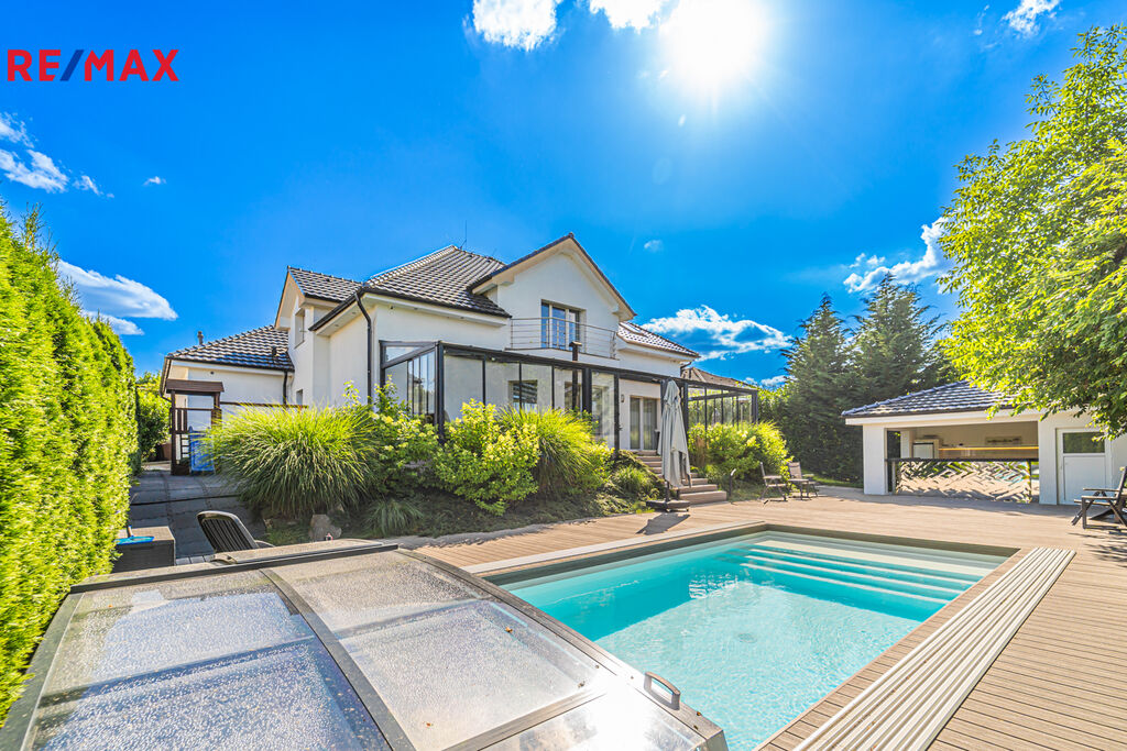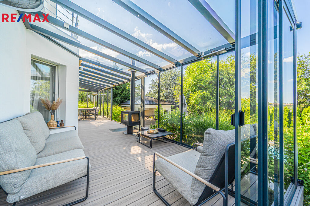 V letních dnech můžete relaxovat u vyhřívaného bazénu nebo si užít grilování v letní kuchyni s barovým pultem, lednicí a myčkou na nádobí. Na prostorné prosklené terase (45 m²) s krbem si zase vychutnáte večery i za chladnějšího počasí.