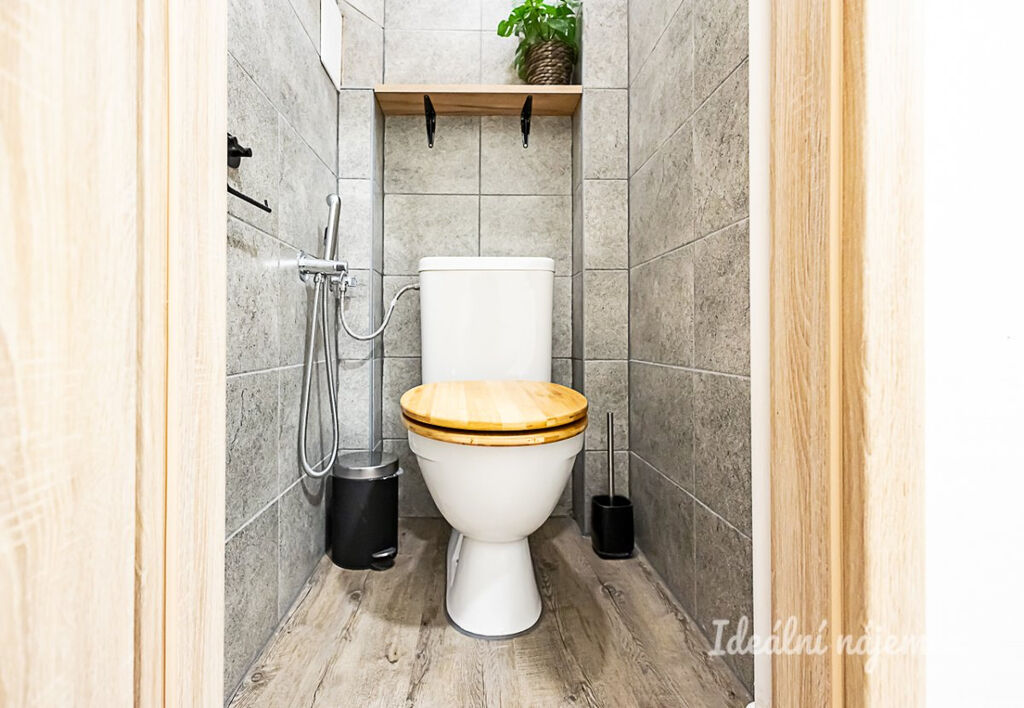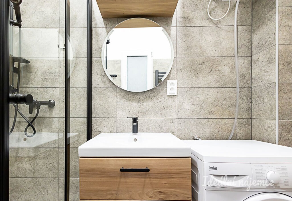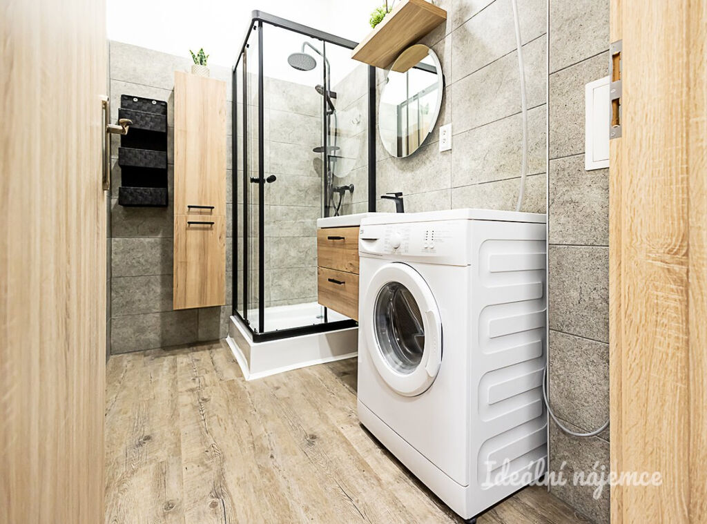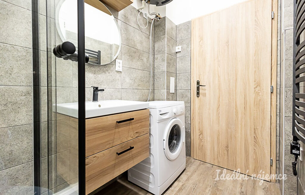 Byt se pronajímá nezařízený – nábytek na fotografiích bude odstěhován, takže si ho můžete vybavit podle vlastních představ. Kuchyňský kout je vybaven myčkou, elektrickou troubou, varnou deskou a digestoří. Obývací část i obě ložnice jsou volné k zařízení. V koupelně je sprchový kout, umyvadlo se zrcadlem a koupelnová skříňka. Toaleta je samostatná.