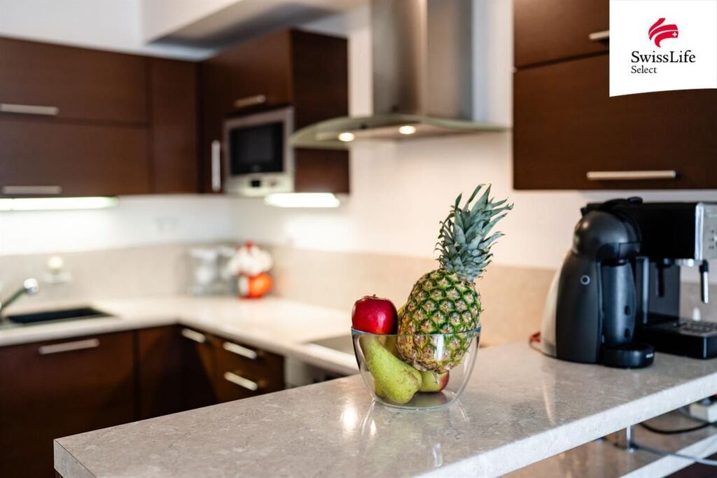 Samotné vybavení bytu bylo pečlivě voleno s důrazem na kvalitu a funkčnost. Kuchyňská linka je včetně spotřebičů, prostorný obývací pokoj plynule navazuje na jídelní a kuchyňskou část. Ložnice i pracovna jsou zařízeny tak, abyste se zde ihned cítili jako doma.
