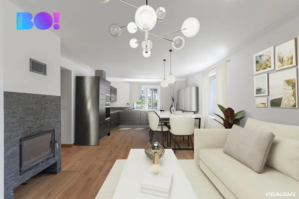 Dům nabízí tři prostorné pokoje, které snadno zařídíte podle svých představ. Hlavním centrem je velký obývací pokoj s krbem, propojený s prostorem pro kuchyňskou linku, kterou si nový majitel navrhne a zrealizuje přesně podle svého vkusu.