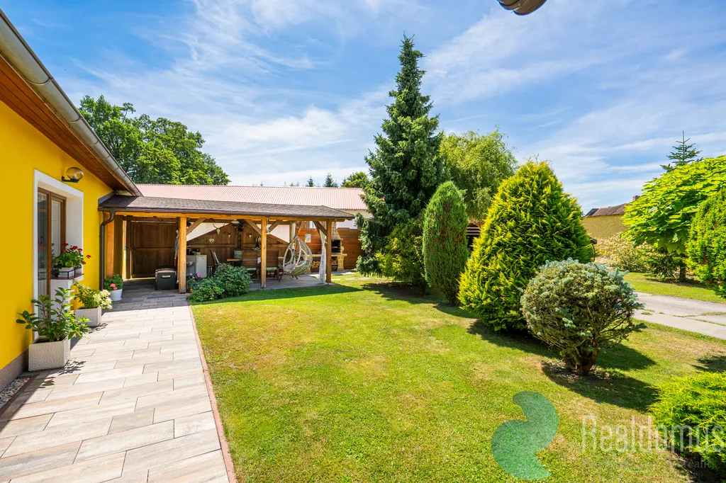 Venkovní posezení s krbem, 2 x přístřešek na vozidla, 2 x studna, příjezdová brána do objektu na el. ovládání.