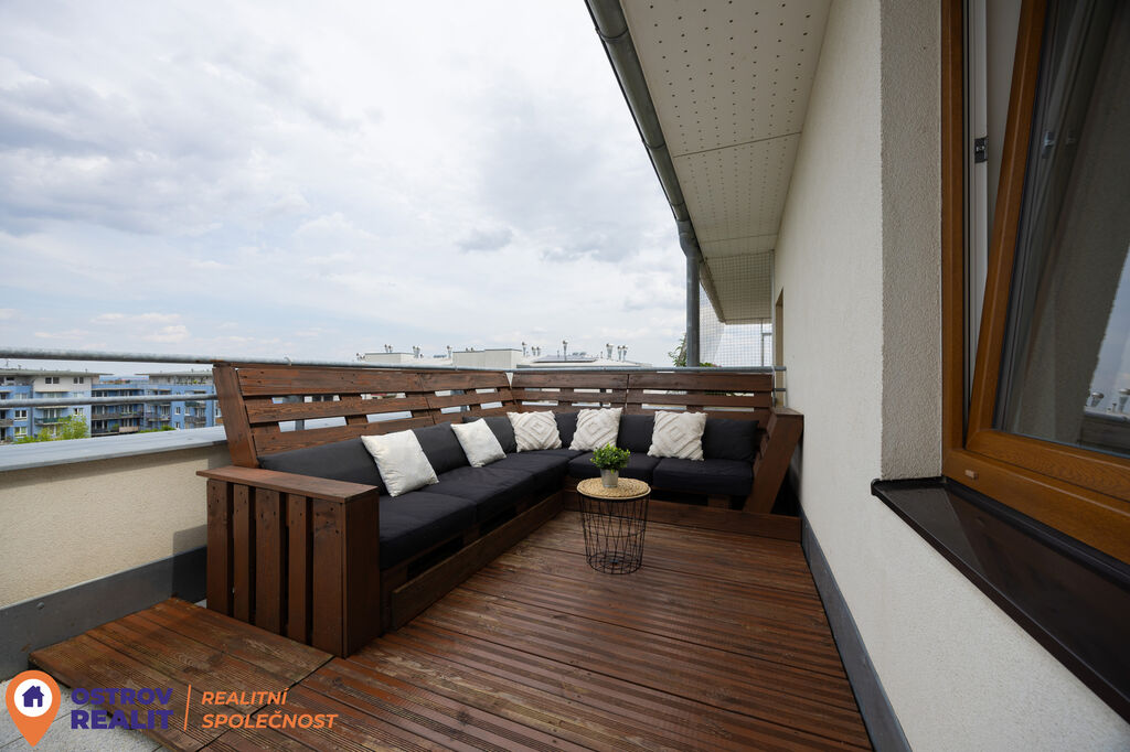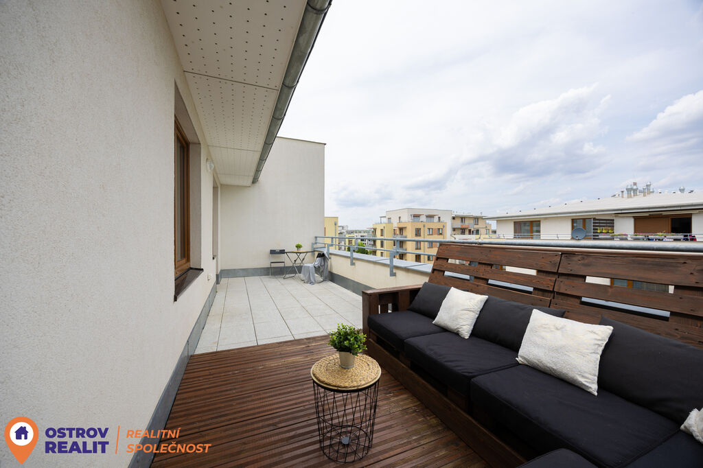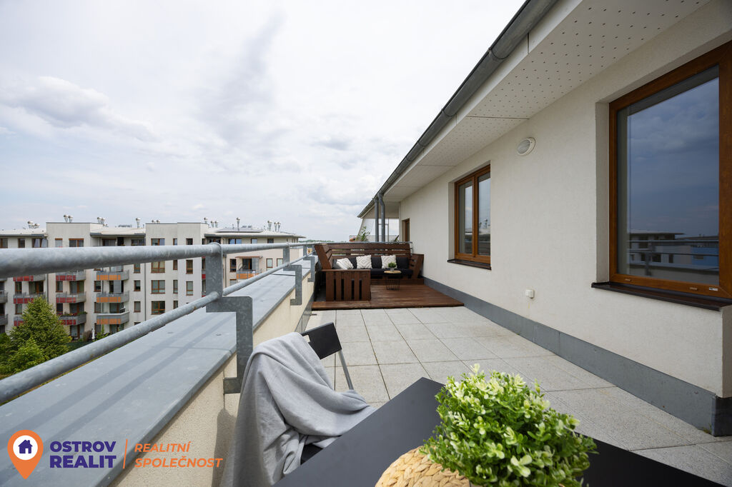 Hlavním lákadlem je rozlehlá terasa orientovaná do klidného okolí, která poskytuje prostor pro venkovní posezení, grilování, relaxaci i dětské hry. Balkón je přístupný přímo z obývacího pokoje a nabízí krásný výhled.