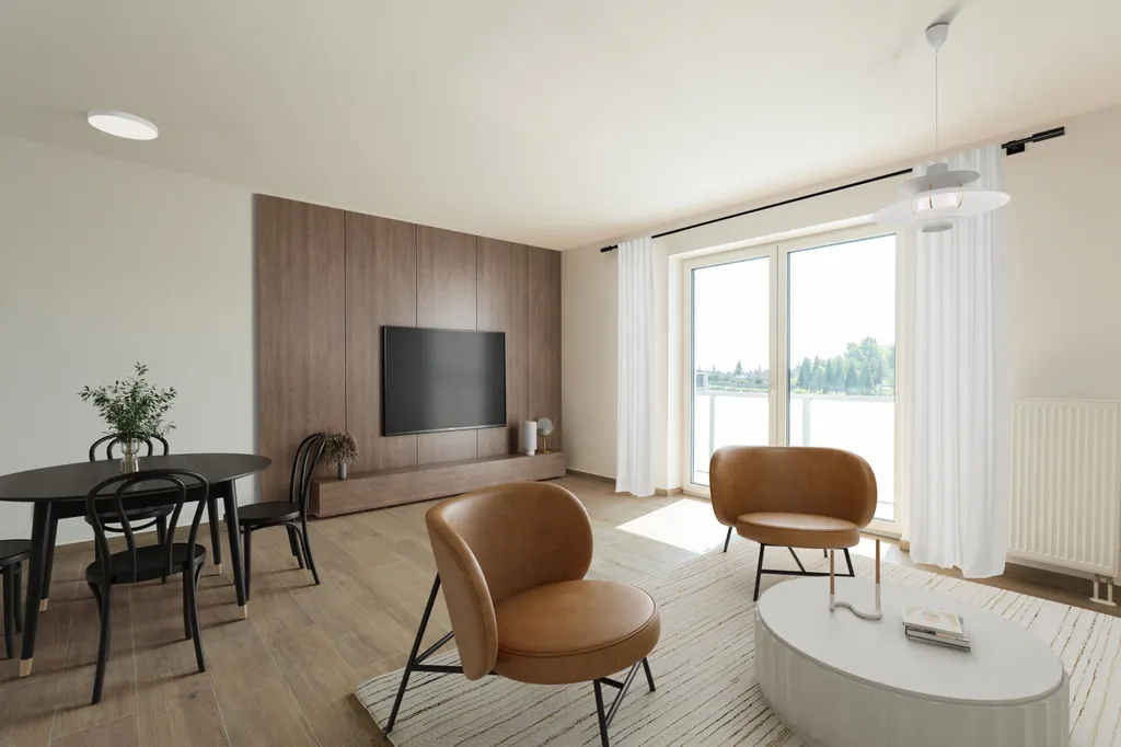 Vnitřní řešení bytových jednotek odpovídá moderním trendům v bydlení. Propojení obývací části s kuchyňskou nabízí větší variabilitu prostor a možnost uplatnit originální řešení. Výsledný otevřený prostor je působivý, vzdušný a jednotliví členové rodiny tak mohou být stále pohromadě.
