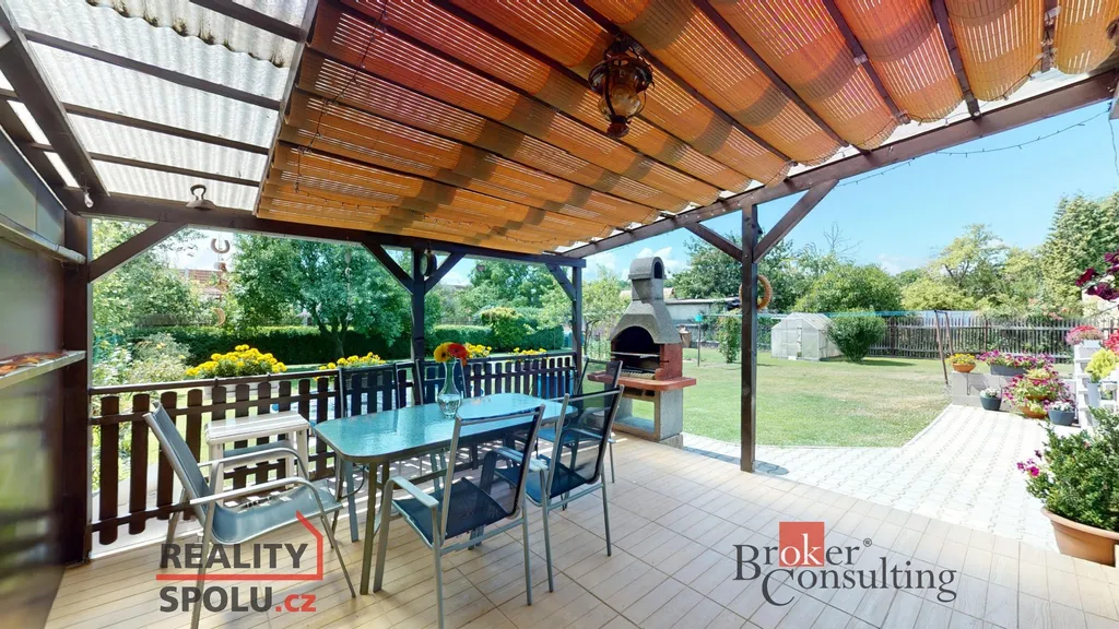 K domu náleží prostorná a pečlivě udržovaná zahrada, která je ideálním místem pro relaxaci, rodinné oslavy nebo dětské hry. K tomu je přizpůsobeno i zázemí zahrady, takže vedle prostorné a zastřešené terasy najdete malou kuchyňku i venkovní gril. Nechybí ani nadzemní bazén, který je částečně zapuštěn do terénu.