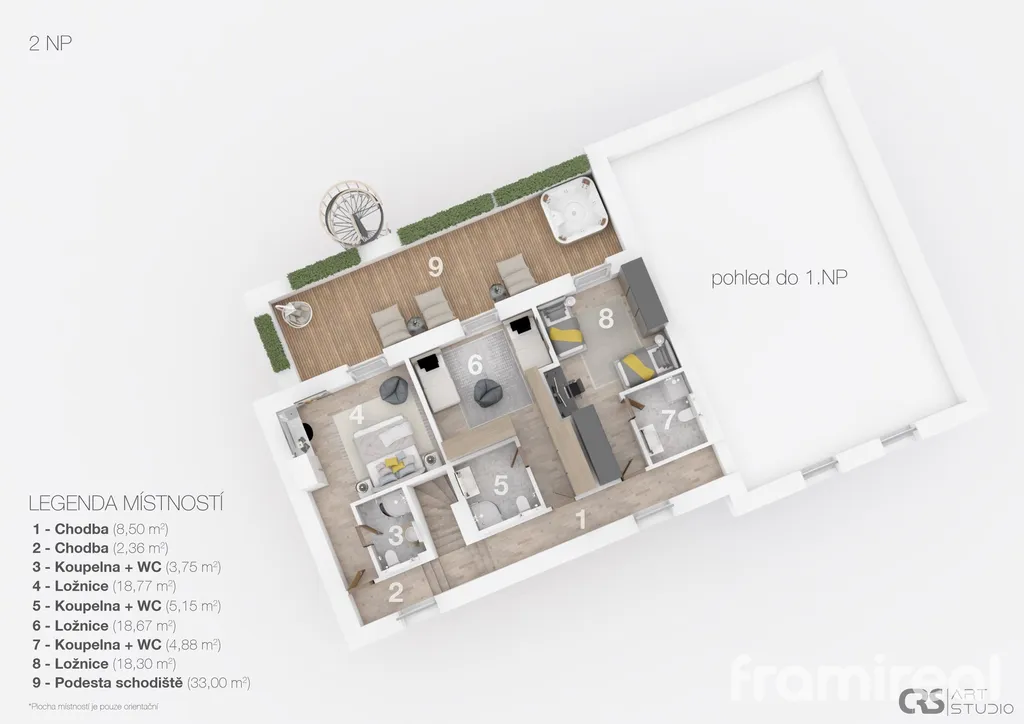 Projektovaný dům o podlahové ploše 292 m² nabízí velkorysé a promyšlené dispoziční řešení: čtyři samostatné ložnice, každá s vlastní koupelnou a toaletou, dvougaráž s přímým vstupem do domu, technické zázemí a množství úložného prostoru. Dominantou domu je 95 m² velký obývací prostor s otevřeným krovem, krbem, jídelnou a barem – srdce celého domu ideální pro rodinné večery i společenská setkání. Z jihozápadně orientované terasy se otevírá působivý výhled na hladinu Lipna a panorama Šumavy.