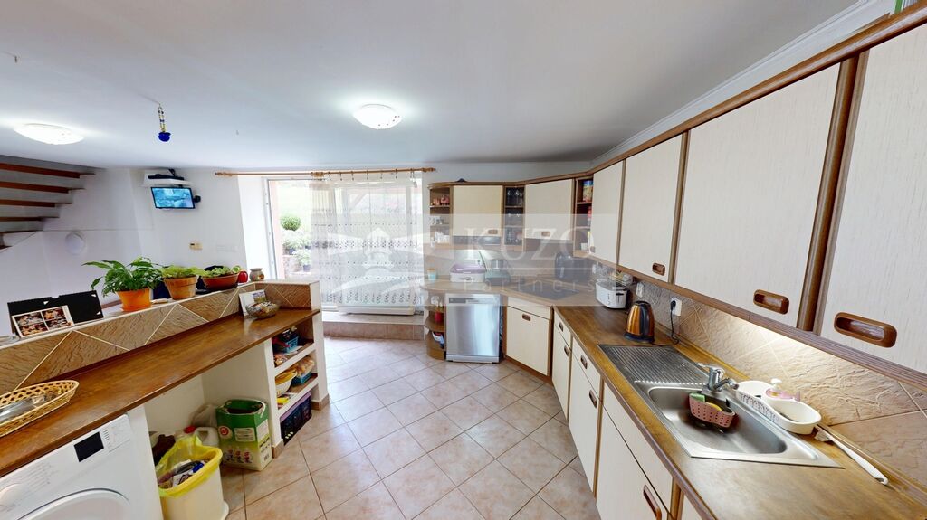 Přízemí: Praktické uspořádání zahrnuje sklad, šatnu a technickou místnost s elektrickým bojlerem. Z vnější strany domu je přístupná kotelna s kotlem na tuhá paliva (uhlí) a elektrokotlem, doplněná bojlerem pro kotel.