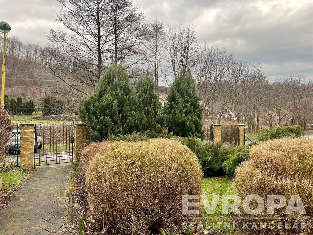 Zahrada je upravená se vzrostlými okrasnými dřevinami. Na pozemek lze vstoupit brankou nebo vjet bránou s elektronickým otevíráním.