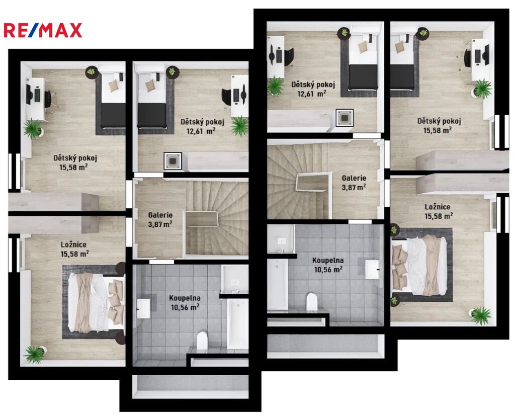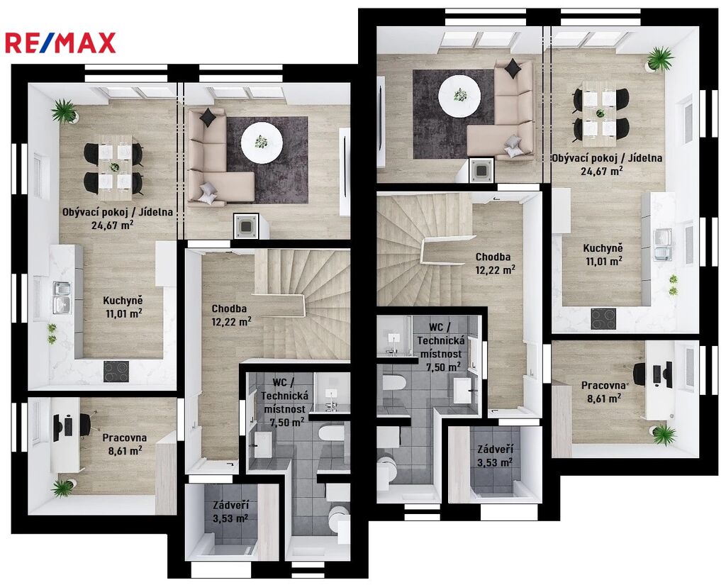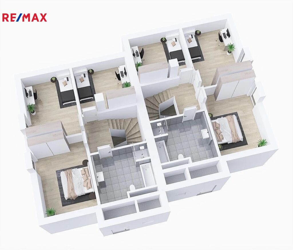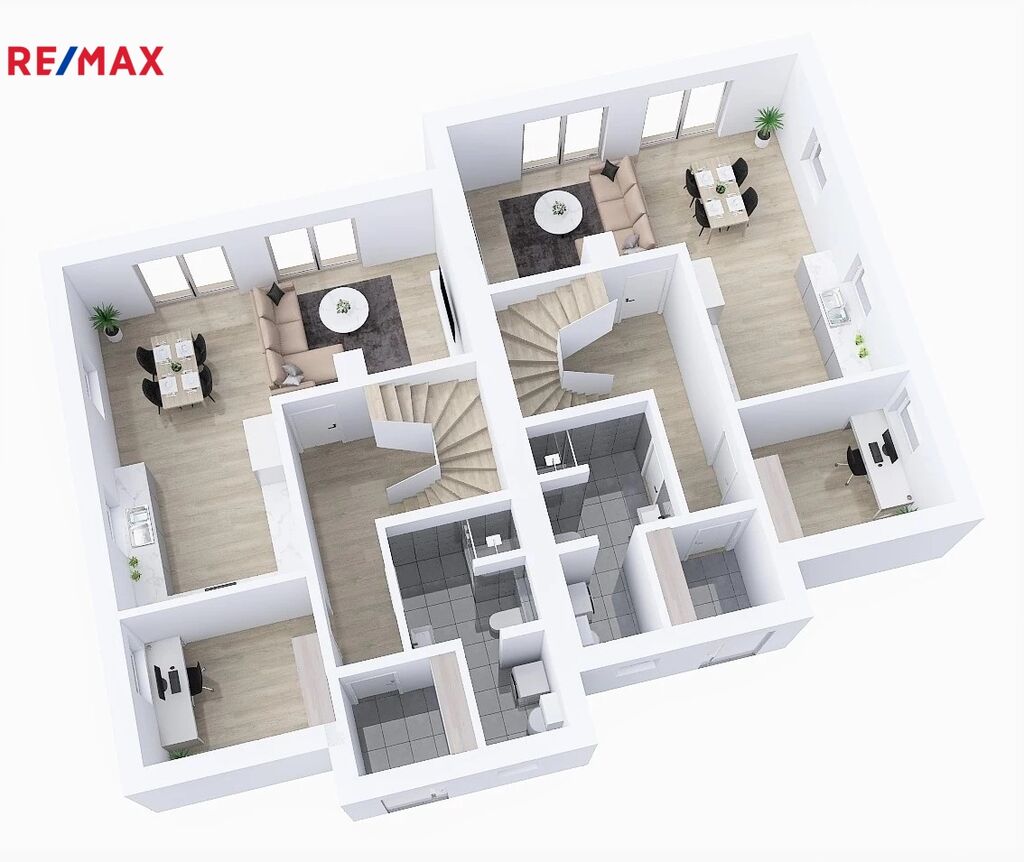 Dispozici 5 + KK doplňuje, pracovna, koupelna a nezbytná technická místnost. Obývací prostor s kuchyní je prosvětlen velkými francouzskými okny, která umožňují snadný přístup na terasu. Dostatek místa nabízejí i tři pokoje v podkroví.