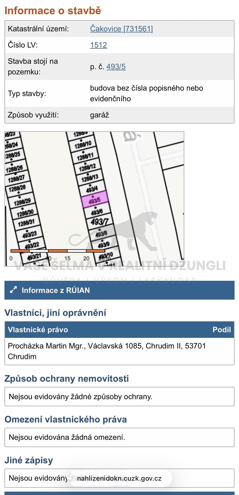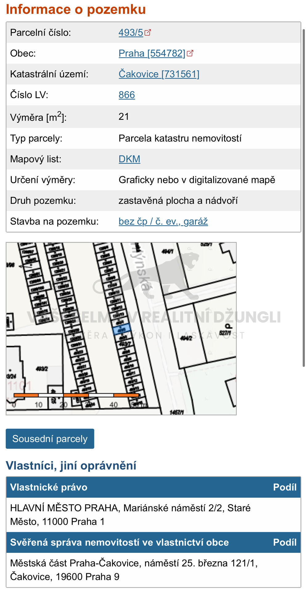 stavba bez čp / č. ev., garáž, zapsaná v KN ve vlastnicví majitele fyzické osoby a na pozemku p. č. 493/5, pozemek města, tedy ve vlastnictví hl.m. Prahy, pod správou obce, smlouva na dobu neurčitou, nájemné za pozemek cca 1.750 Kč ročně, nezvyšuje se, je dáno předpisem - to je výhoda.
