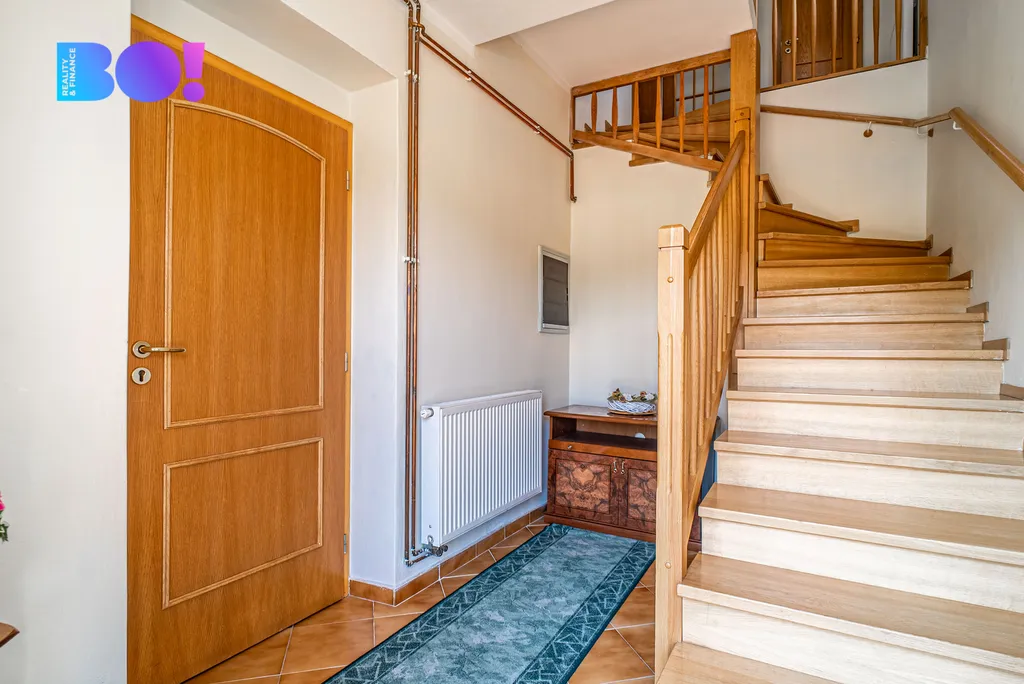 Z obývacího pokoje v patře je přímý vstup na velký balkon s krásným výhledem do okolní přírody, který nabízí ideální prostor pro ranní kávu, odpočinek nebo večerní posezení.