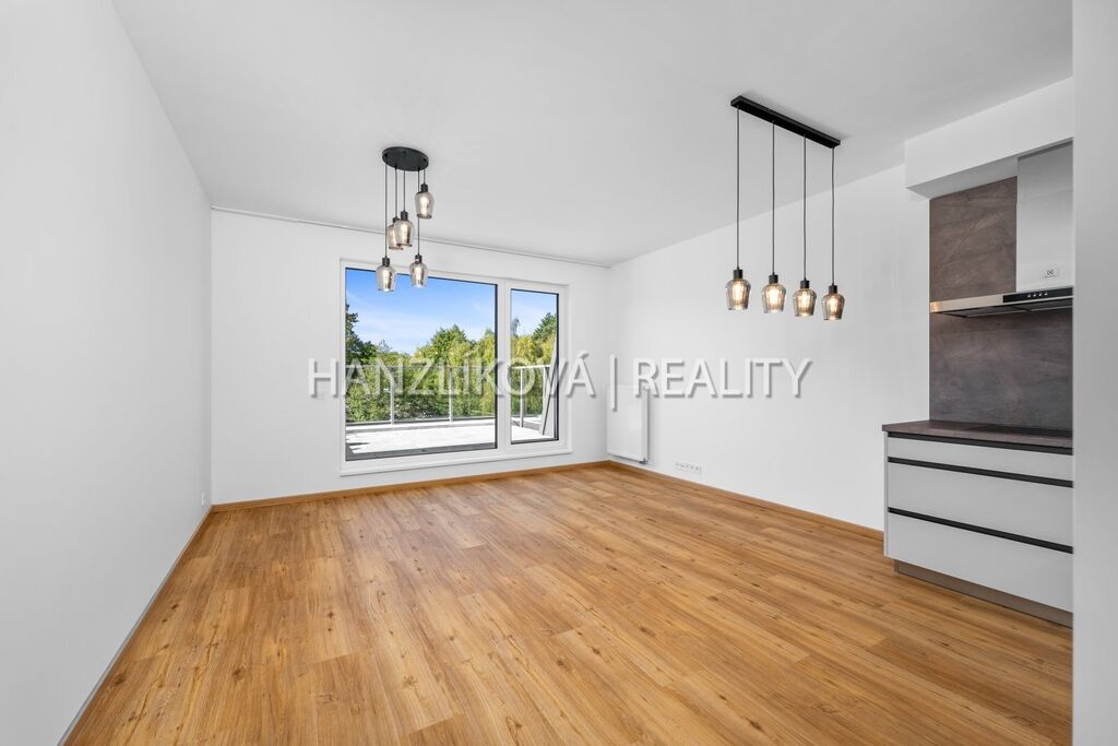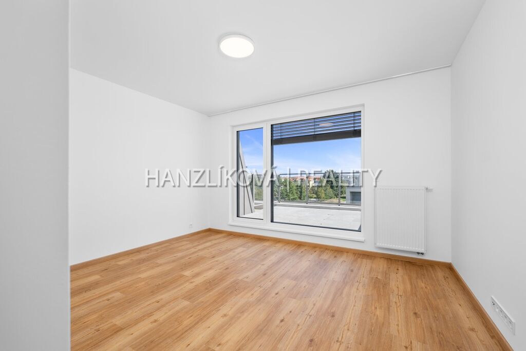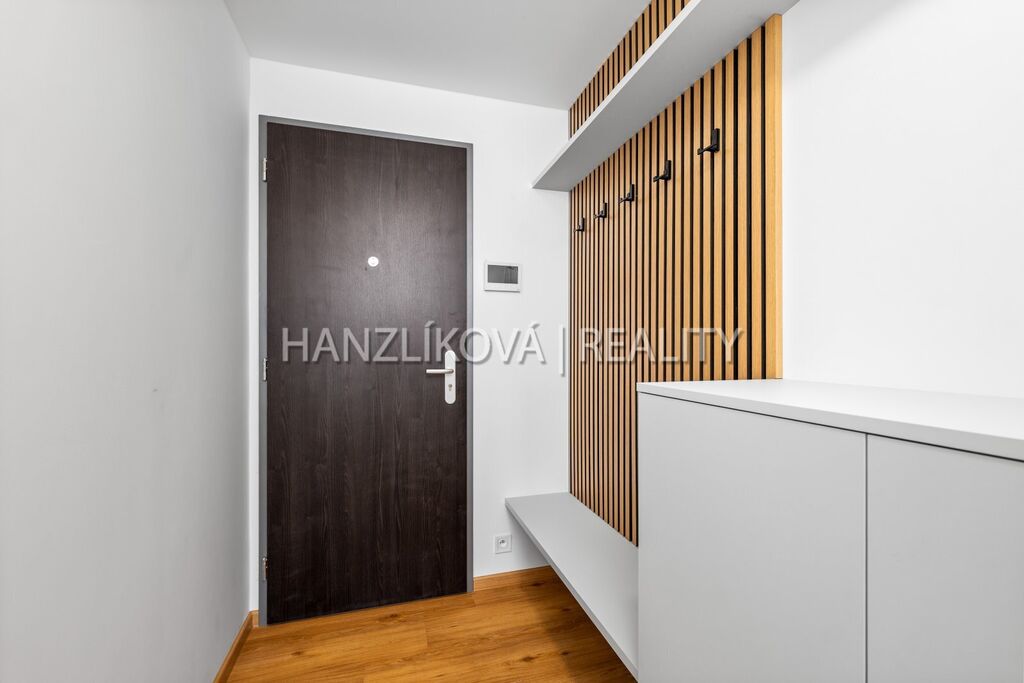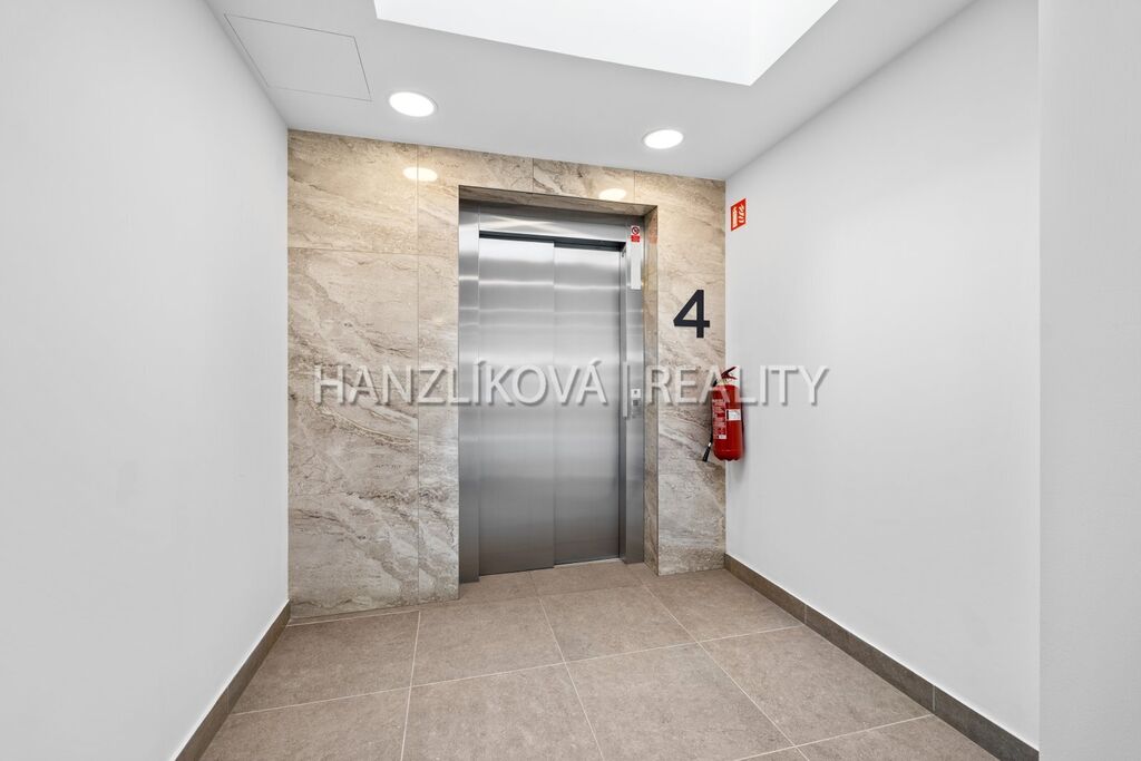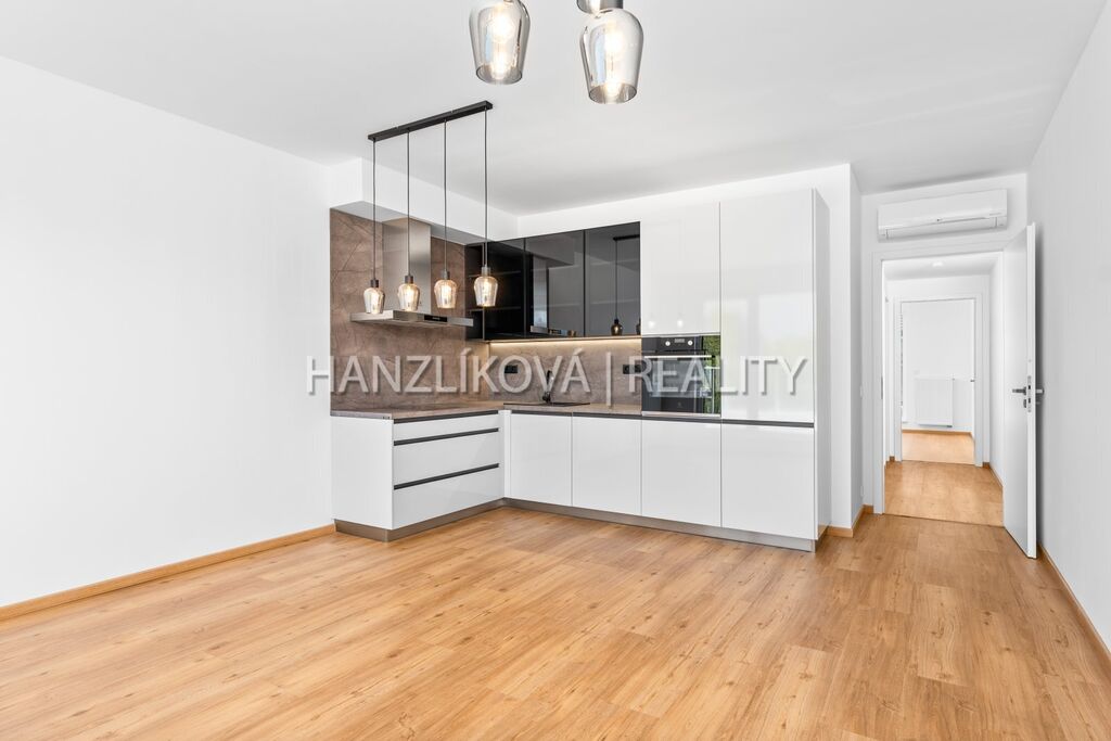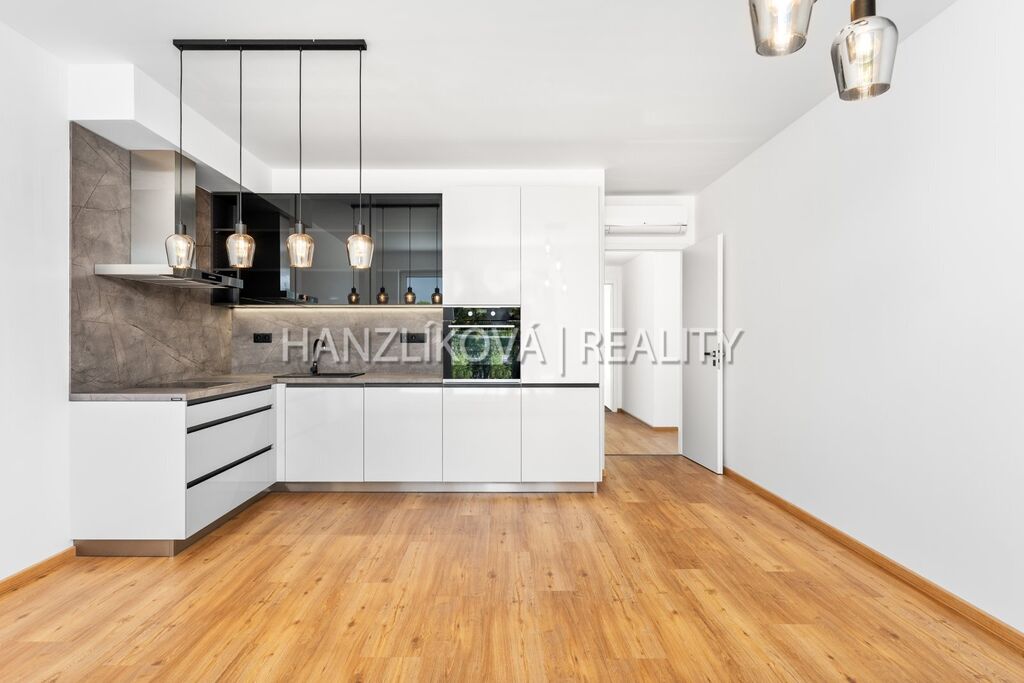 Byt je částečně vybaven – kuchyňská linka na míru od kuchyňského studia Hanák včetně značkových elektrospotřebičů, barový pult, osvětlení ve všech místnostech, klimatizační jednotky, předsíňová stěna, předokenní venkovní žaluzie.