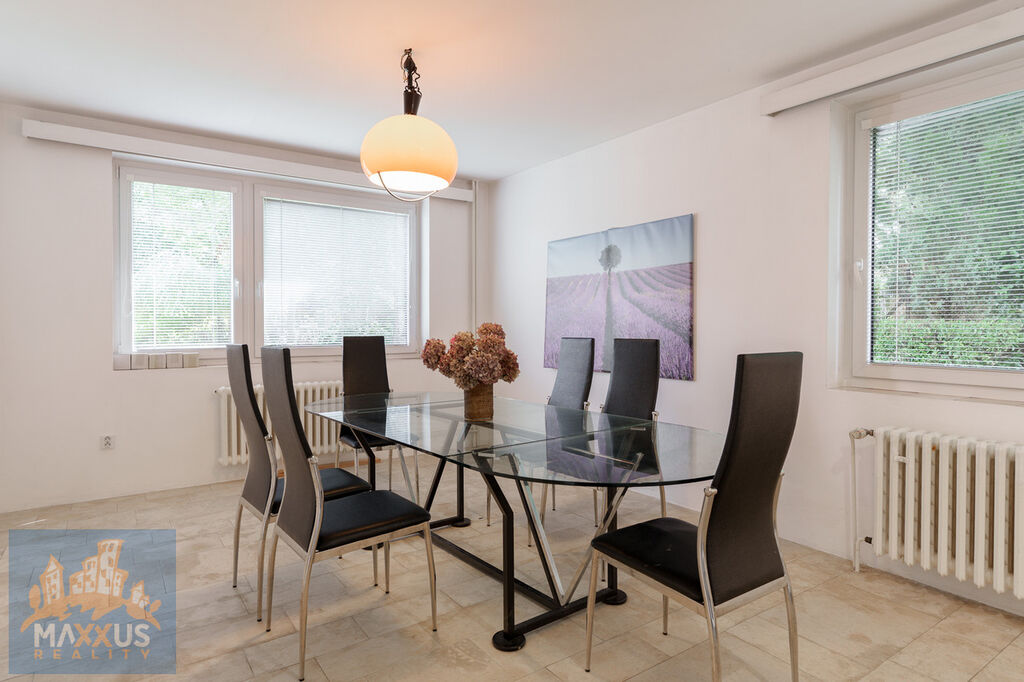 Pronájem nadčasové dvougenerační vily o dispozici 11+2 se zahradní terasou a garáží. Vila se nachází v oblíbené a vyhledávané lokalitě Prahy 4 – Lhotka. Vila se zastavěnou plochou 236 m2 leží na pozemku s rozlohou 1044 m2. Na pozemku zahradou se vzrostlou a udržovanou vegetací. V blízkosti příroda a skvělá dopravní dostupnost - tram, bus, v okolí také mezinárodní škola. Dům o velkorysé užitné ploše 436 m2 se rozkládá ve třech podlaží. V suterénu domu se nachází hala se schodištěm, ze kterého se vchází do kotelny/prádelny, garáže, sklepu a obytné části. Z obytné části je vstup do vybavené kuchyně a ložnice s vlastní šatnou a koupelnou. K obývací místnosti náleží zahradní terasa 13 m2 ze které je dále vstup do zahrady. V přízemí domu se nachází vstupní schodišťová hala (komunikační uzel) s předsíní a prostorným obývacím pokojem vybaveným krbem na dřevo. Z obývacího pokoje dále vstup do ložnice se šatnou, koupelnou, samostatnou toaletou a pracovnou. Dále je zde spotřebiči vybavená kuchyně o rozloze 28,9 m2. V přízemí domu je samostatný vchod ze vstupní haly do hostinského pokoj s vlastní šatnou i koupelnou. Patro domu je dispozičně řešeno stejně jako přízemí. V podkroví se nachází ateliér vhodný pro pracovnu a úložné prostory. Parkování je možné v garáži či na pozemku. Energie se převádí na nájemce (měsíční odhad za celý dům okolo 12.000,- Kč/měsíc). Dům je volný k nastěhování ihned. Plánky domu jsou na konci galerie. PENB nebyl dodán, a tudíž třída energetické náročnosti je dle vyhlášky 148/2000 Sb. uvedena jako G. Makléř doporučuje prohlídku.