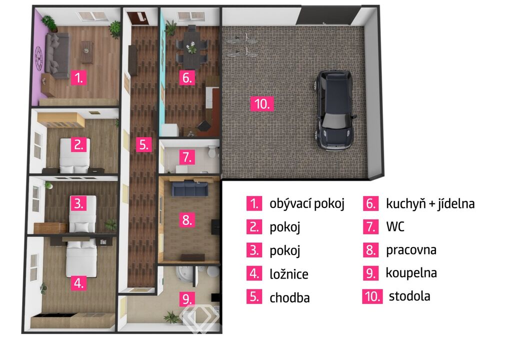 Dispozice domu je velmi praktická – najdete zde obývací pokoj, ložnici a dva dětské pokoje, které lze případně využít také jako pracovnu či pokoj pro hosty. Kuchyně je propojena s jídelnou, což vytváří příjemný a otevřený prostor pro rodinná setkání. K dispozici je také prostorná koupelna se sprchovým koutem a samostatné WC.
