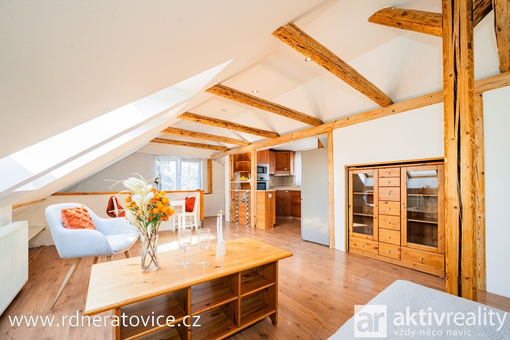 Do podkroví vejdete přes vstupní chodbu po schodišti s dřevěnými stupnicemi. Dispozice nabízí obývací pokoj s jídelnou a kuchyní na míru (myčka Bosch, sklokeramická deska Fagor), ložnici, dětský pokoj, pracovnu, technickou místnost a koupelnu s vanou, WC, přípojkou na pračku a vstupem na balkon. Byt má vlastní měřiče vody, elektřiny i plynu. Vytápění a ohřev vody zajišťuje plynový kotel.