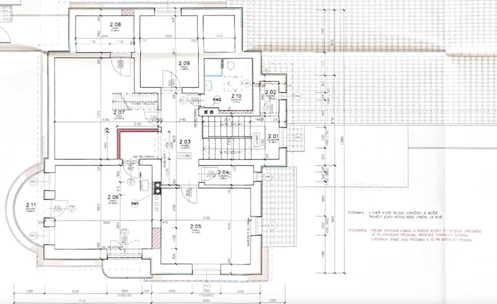 V 1.NP - zádveří s vestavěnými skříněmi, prostorná chodba, obývací pokoj s krbem, jídelna a navazující, moderní kuchyně s francouzským oknem a výhledem do zahrady. Z chodby je rovněž vstup do prostorů koupelny, sauny, vnitřního bazénu s protiproudem a sklepních prostorů. Z 1.NP se nádherným, původně zachovaným schodištěm dostanete do 2.NP. V obou patrech včetně mezipatří se nachází prostorné komory.