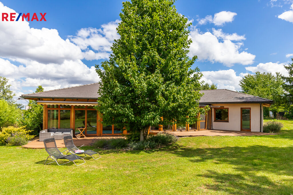 K prodeji nabízím výjimečný přízemní bungalov /rodinný dům o dispozici 5+kk a dalšími dvěma pracovnami, vnitřním bazénem, rozlehlou zahradou s venkovní saunou a samostatnou garáží,