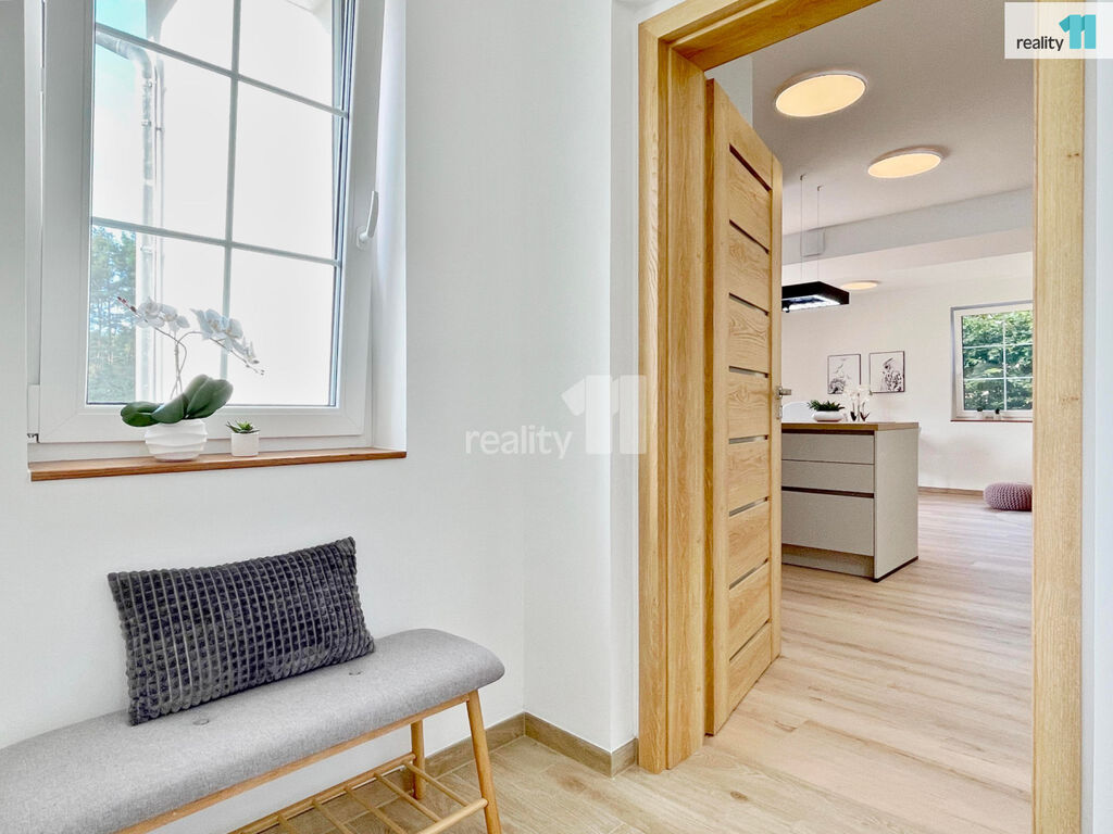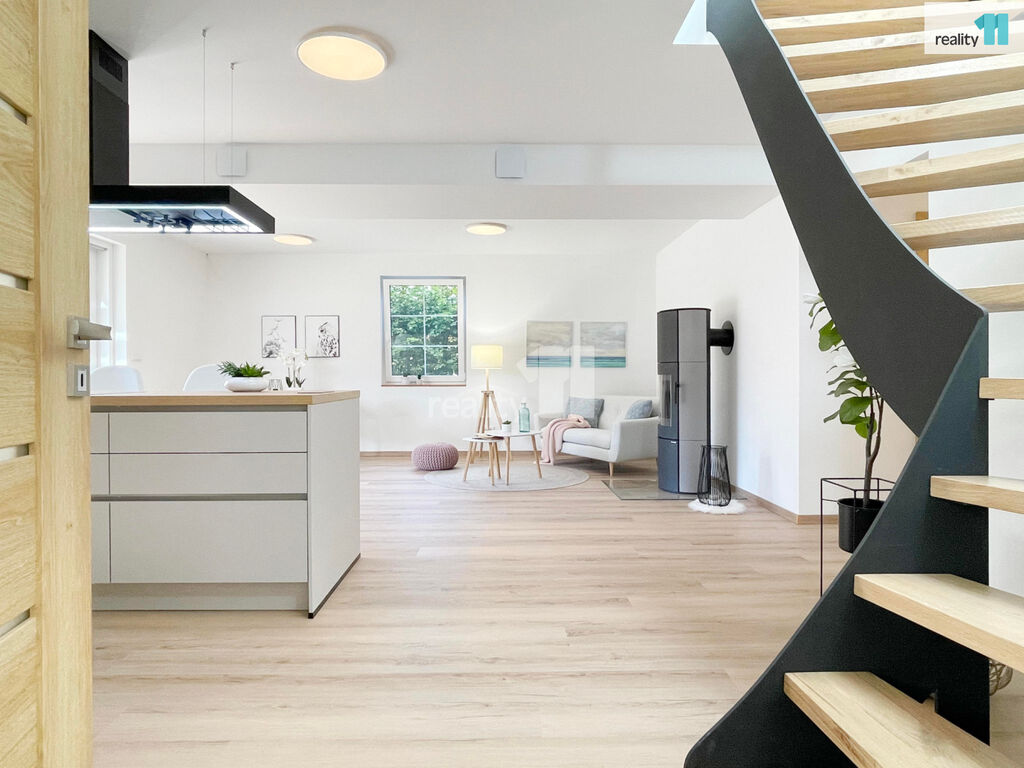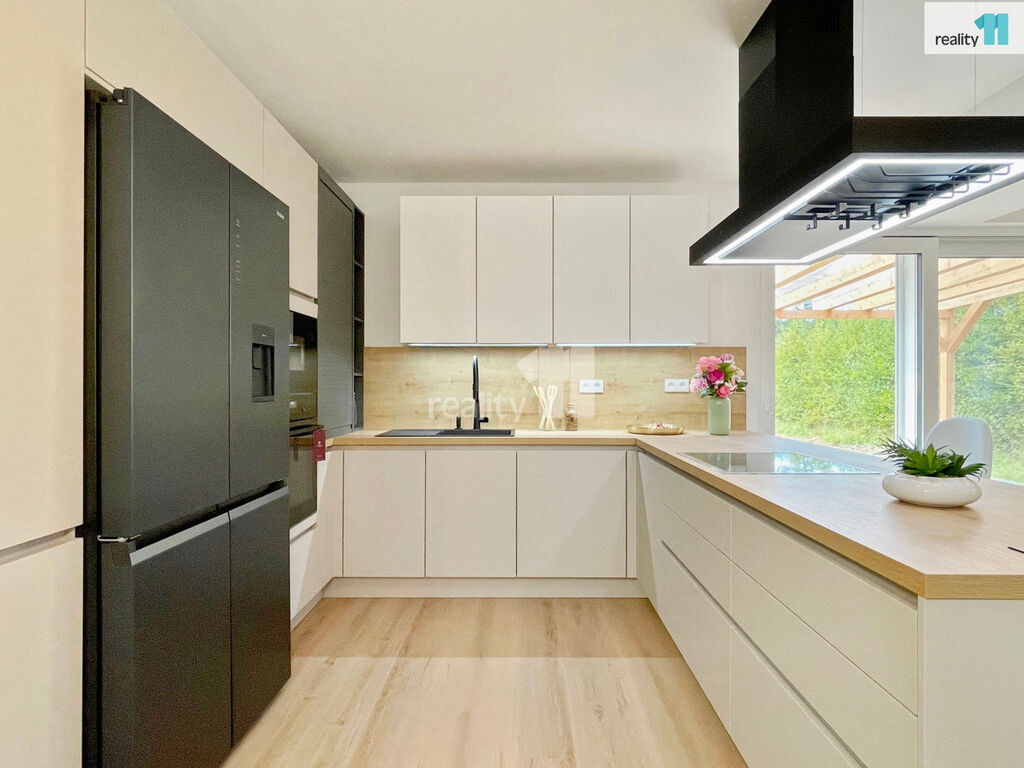 Již při vstupu Vás okamžitě zaujme prostorné, slunné zádveří a otevřený koncept obývacího pokoje propojeného s na míru realizovanou kuchyní. Kuchyňská linka je vybavena všemi moderními spotřebiči – indukční varnou deskou, zabudovanou troubou, mikrovlnkou, myčkou, prostornou lednicí s mrazákem – a nechybí ani stylový kuchyňský ostrůvek, kolem kterého se bude odehrávat život celé rodiny. Světlá podlaha a velká okna vnášejí do domu radostnou atmosféru a propojují interiér se zelení za okny.