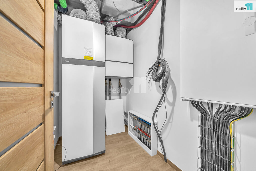 Dům je energeticky úsporný, vybaven rekuperací a tepelným čerpadlem, topení je v celém prostoru podlahové, v některých místnostech doplněné radiátory. Vlastní parkování a oplocený pozemek jen umocňují pocit bezpečí a domova.