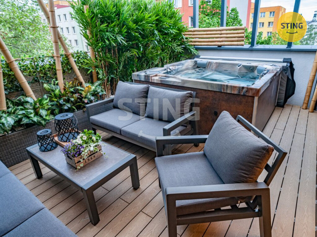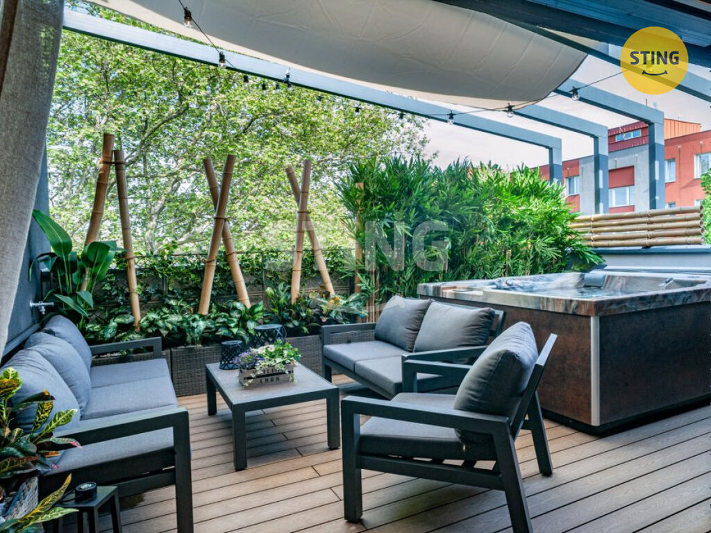 Střešní terasa s privátní vířivkou pro pět osob 20m2 oáza klidu nad pulzujícím městem s výhledem, který bere dech.
