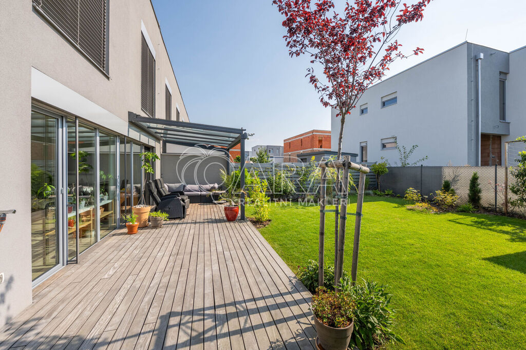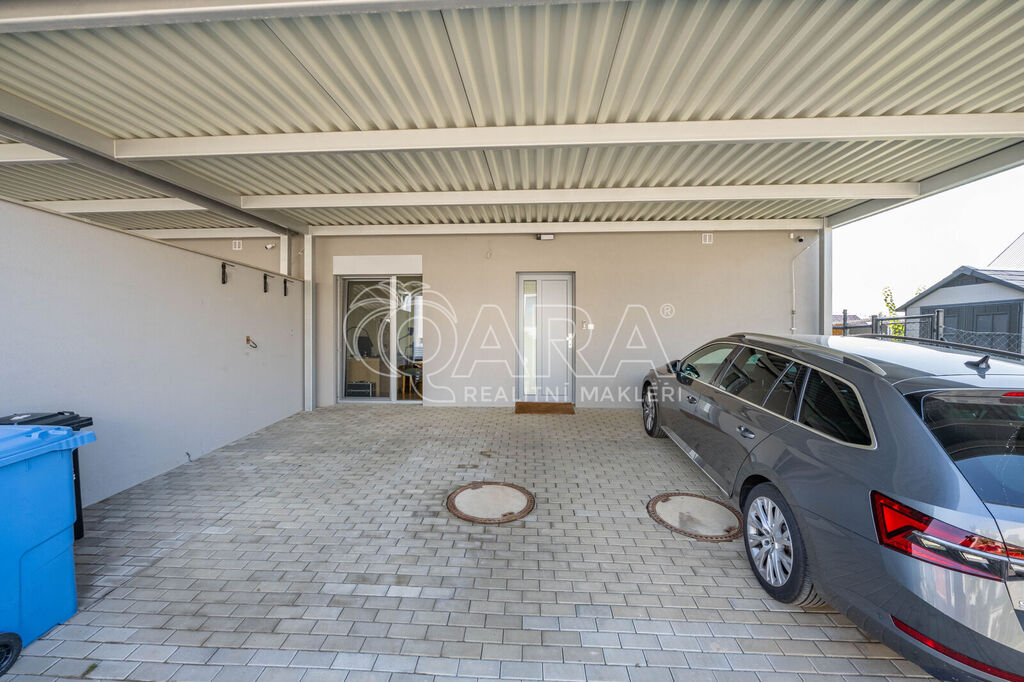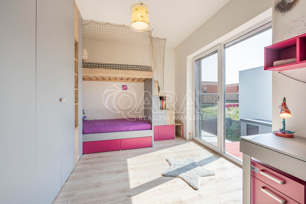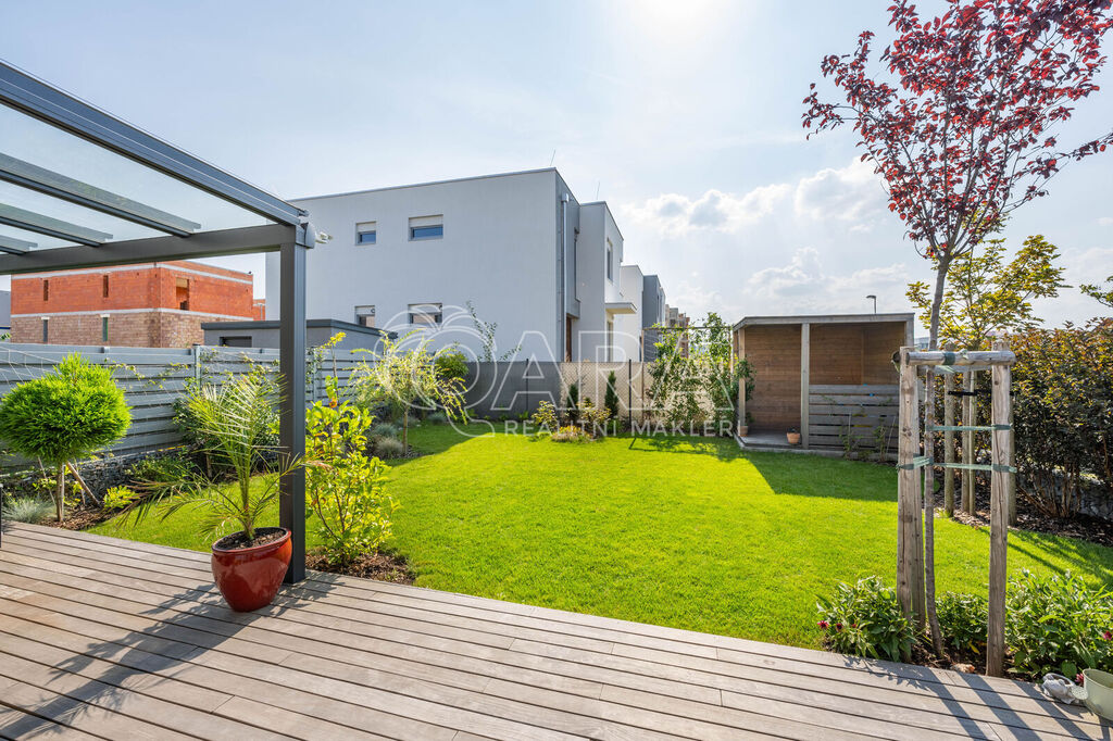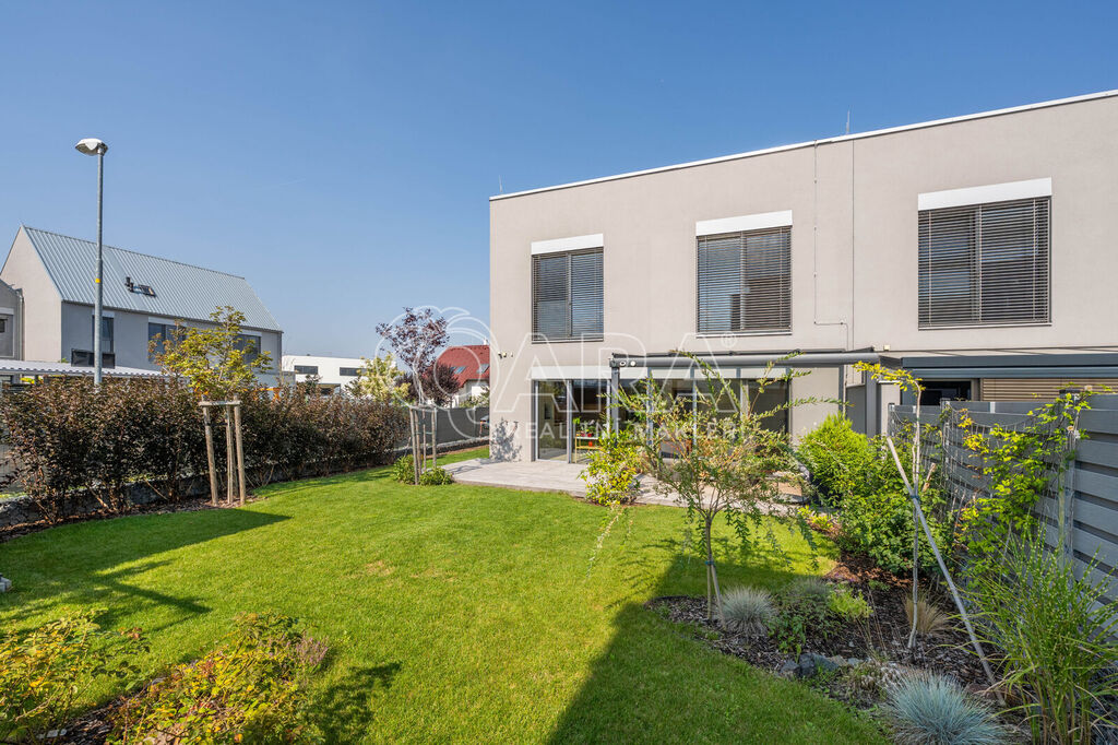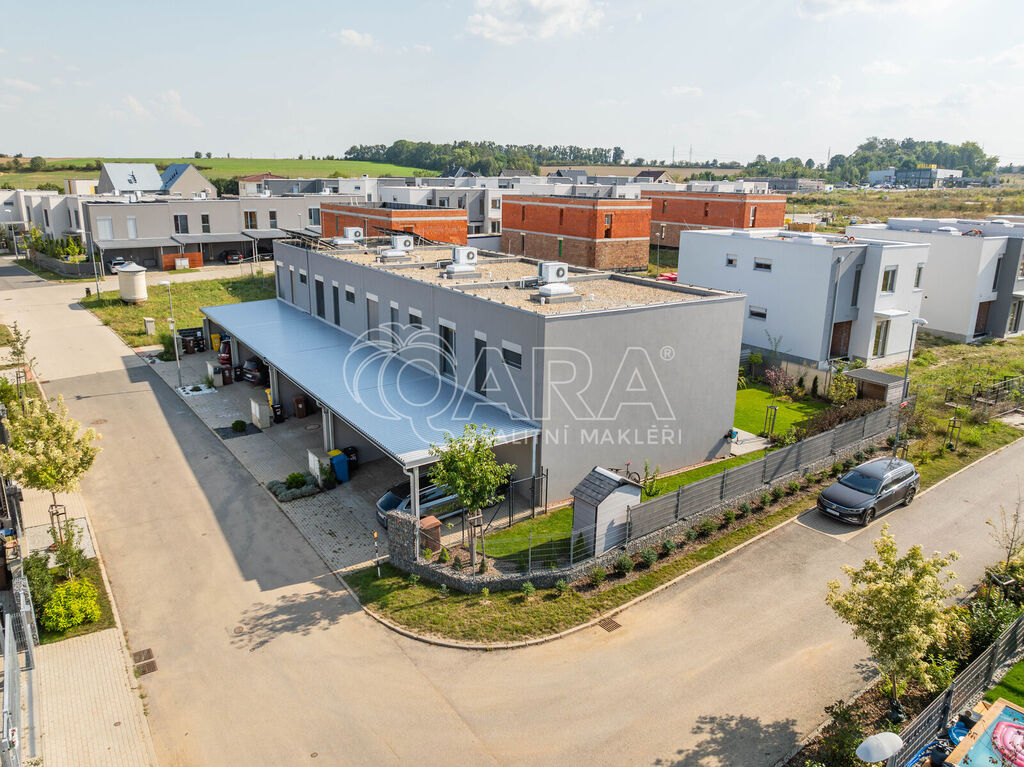 Tento krajní řadový rodinný dům o dispozici 5+kk a podlahové ploše 125 m2 se nachází na pozemku o velikosti 299 m2 a je obklopen zelení. Samotný dům se rozkládá na dvou podlažích. Ve spodním podlaží se nachází z předsíně přístupný obývací pokoj s kuchyní, koupelna se sprchovým koutem a WC, pracovna a prostorná technická místnost. Ve vrchním podlaží pak najdete 3 ložnice, šatnu a koupelnu s vanou, WC a bidetem. V exteriéru na vás čeká zastřešené parkovací stání pro 2 vozy, tak akorát velká zahrada a prostorná terasa. Celá nemovitost je ideálně orientovaná ke slunci. Obývací pokoj a ložnice směřují na jihozápad, boční část domu je na severozápad a čelní část, kde najdete pracovnu a ložnici, směřují na severovýchod.