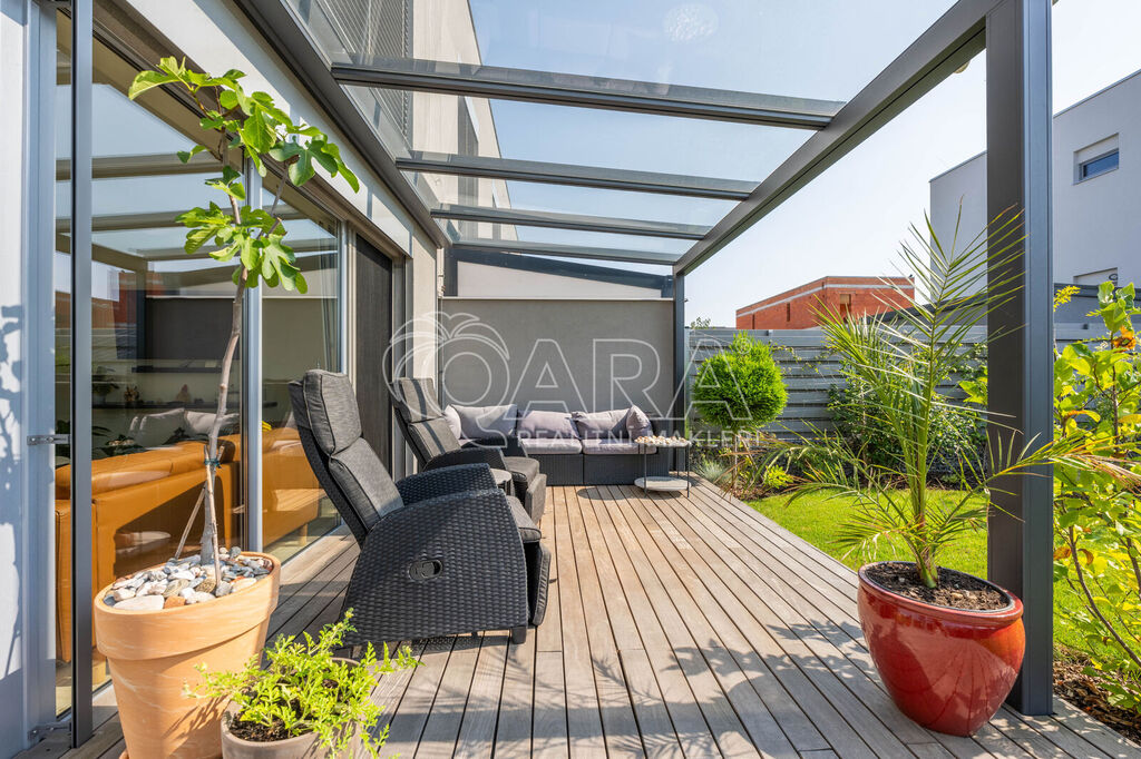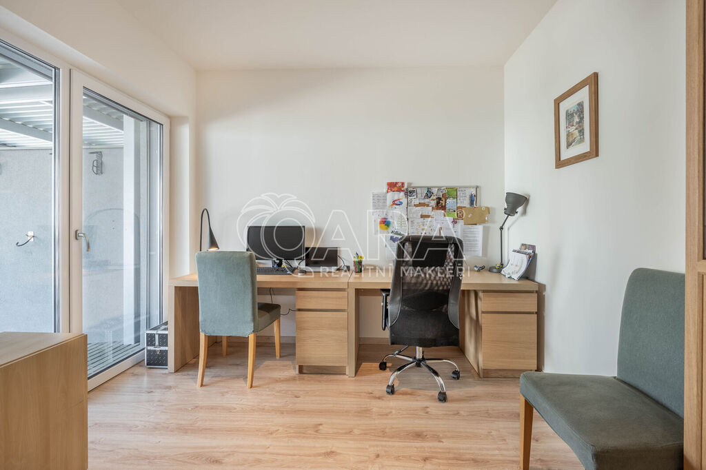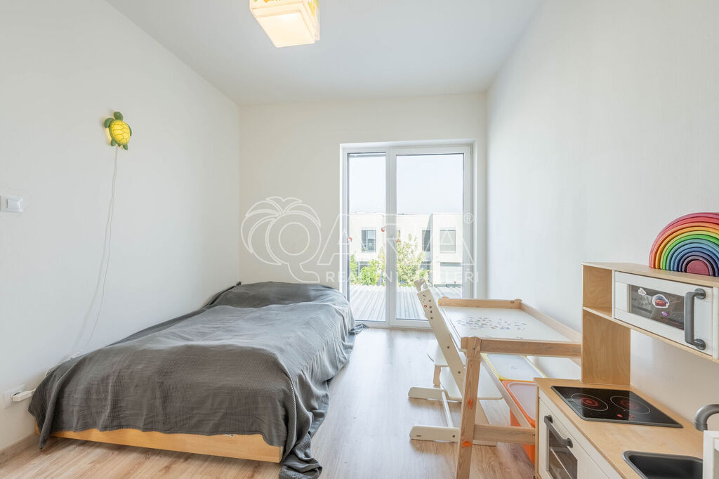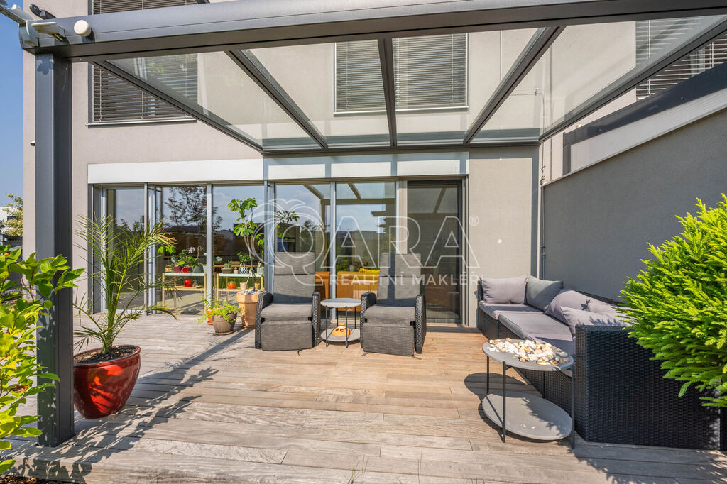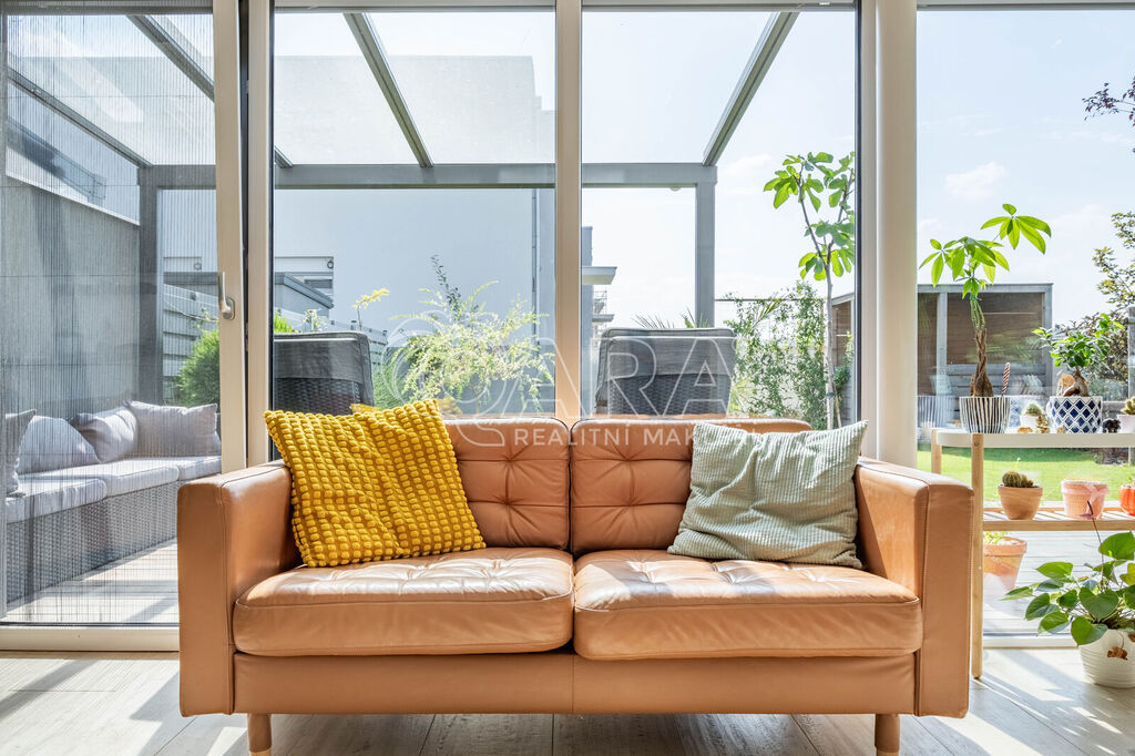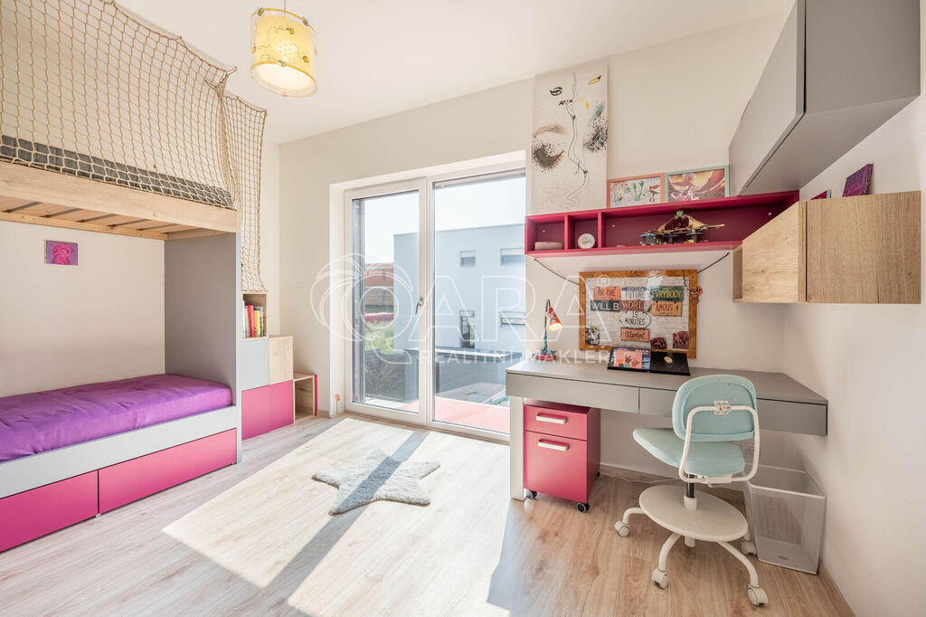 Tento krajní řadový rodinný dům o dispozici 5+kk a podlahové ploše 125 m2 se nachází na pozemku o velikosti 299 m2 a je obklopen zelení. Samotný dům se rozkládá na dvou podlažích. Ve spodním podlaží se nachází z předsíně přístupný obývací pokoj s kuchyní, koupelna se sprchovým koutem a WC, pracovna a prostorná technická místnost. Ve vrchním podlaží pak najdete 3 ložnice, šatnu a koupelnu s vanou, WC a bidetem. V exteriéru na vás čeká zastřešené parkovací stání pro 2 vozy, tak akorát velká zahrada a prostorná terasa. Celá nemovitost je ideálně orientovaná ke slunci. Obývací pokoj a ložnice směřují na jihozápad, boční část domu je na severozápad a čelní část, kde najdete pracovnu a ložnici, směřují na severovýchod.
