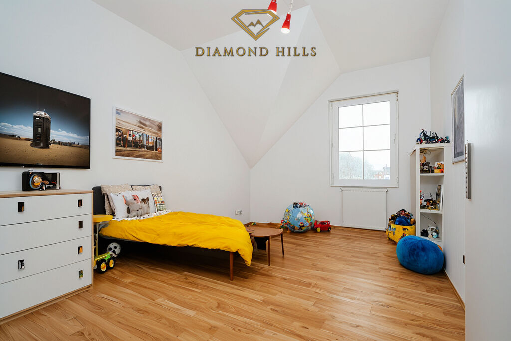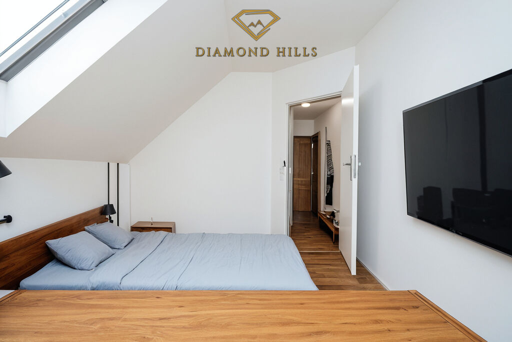 V přízemí vás přivítá samostatný vchod s předsíní a schodištěm do obytné části. Hlavní patro nabízí otevřený a světlý obývací prostor s kuchyňským koutem, kde nechybí vestavné spotřebiče (trouba, varná deska, lednice s mrazákem, digestoř). Ložnice vás okouzlí výhledem na horu Říp, který si můžete vychutnat z balkonu se šálkem dobré kávy. Třetí pokoj skvěle poslouží jako dětský pokoj, pracovna nebo pokoj pro hosty.