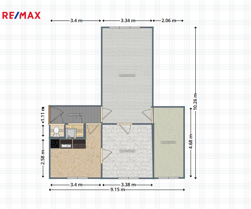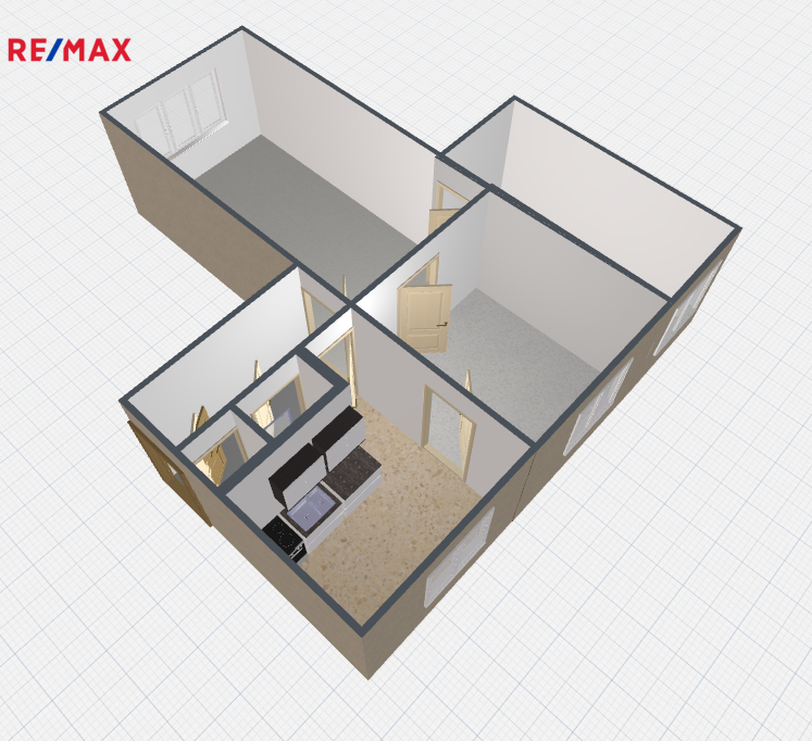 Interiér bytu se skládá ze vstupní chodby s praktickými vestavěnými skříněmi, které poskytují dostatek úložného prostoru. Kuchyně je vybavena kuchyňskou linkou a nechybí ani malá spíž pro uskladnění potravin. Prostorný obývací pokoj je přístupný z chodby, pokoje i ložnice.