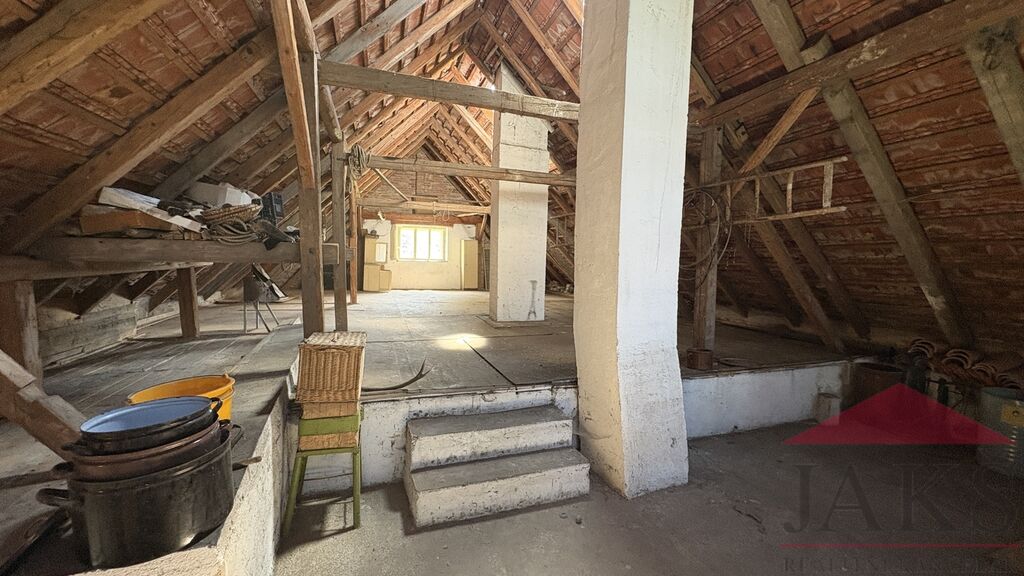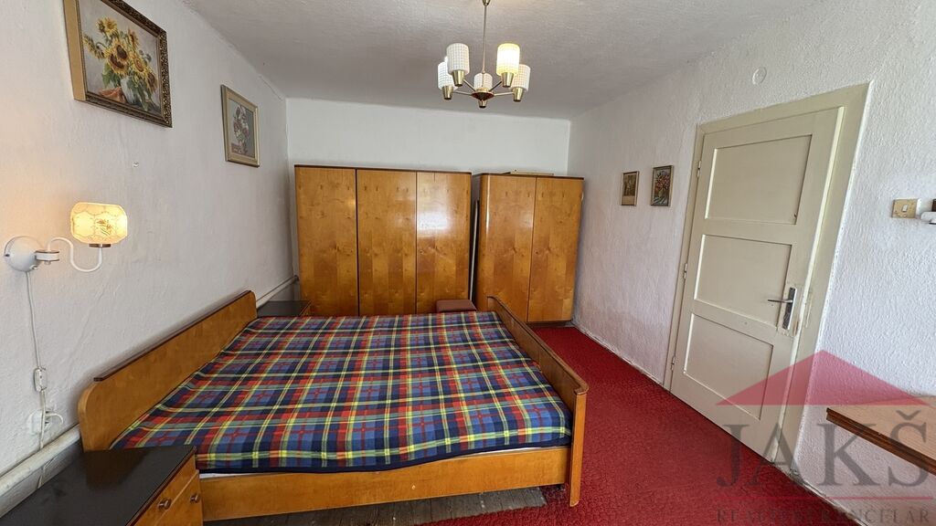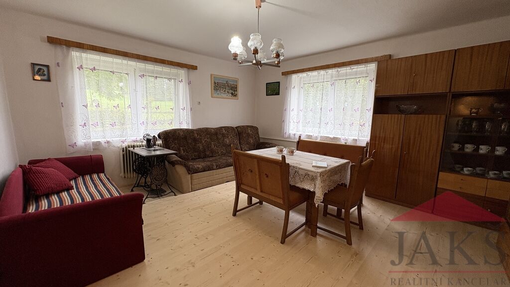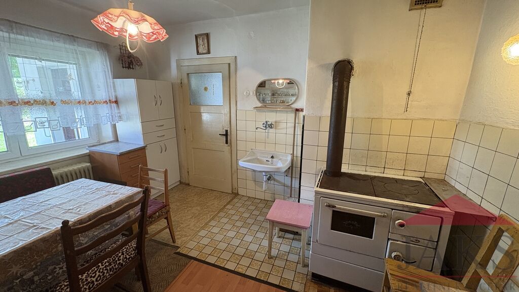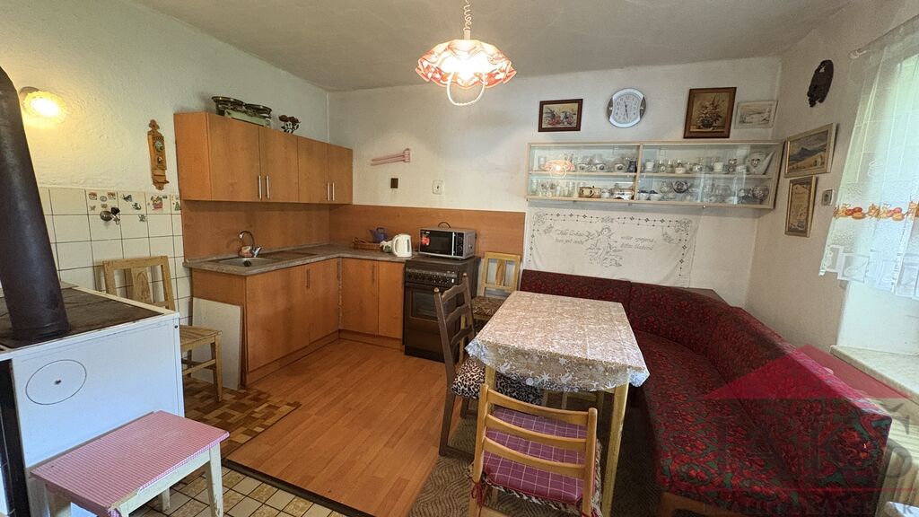 Popis: přízemí: venkovní zastřešená veranda, vstupní veranda, chodba, komora, koupelna (vana, WC, vývody na pračku) s oknem, kuchyň (kuch. linka s dřezem, el. sporák, umyv., el. sporák, sporák na T.P.) s jídelnou, obývací pokoj (nová dřevěná podlaha) a ložnice; půda.