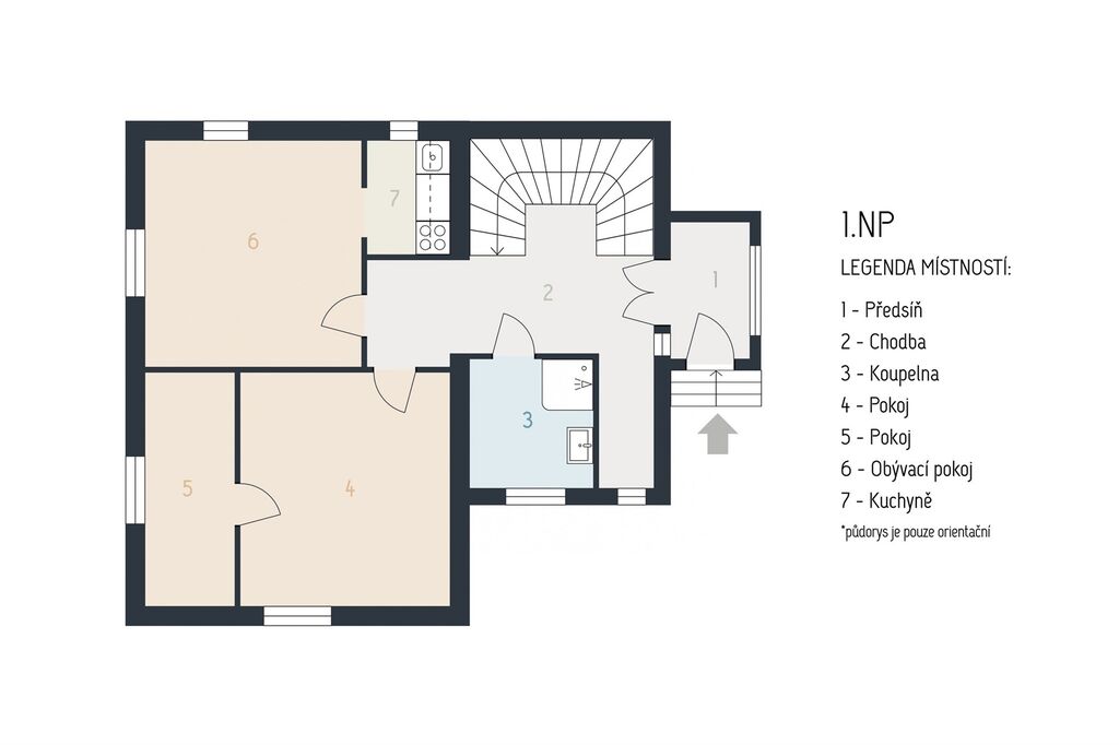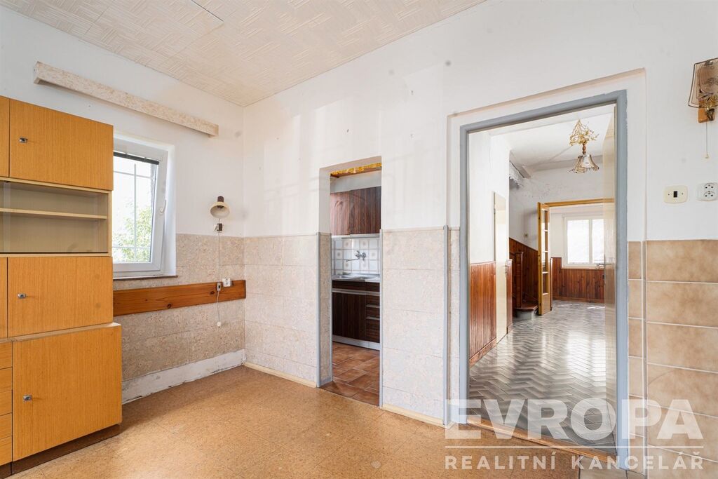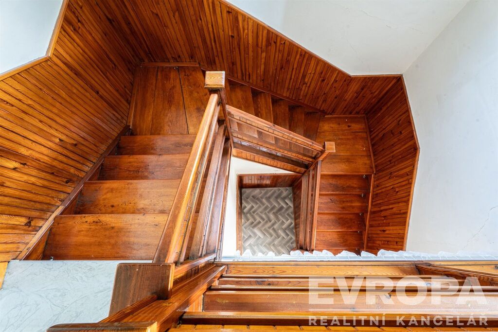 V prvním N.P. jsou 2 místnosti, obývák, kuchyň, WC, koupelna, spíž a předsazená předsíň, z které se vchází do chodby spojené s dřeveným původním schodištěm, která propojuje všechny místnosti.