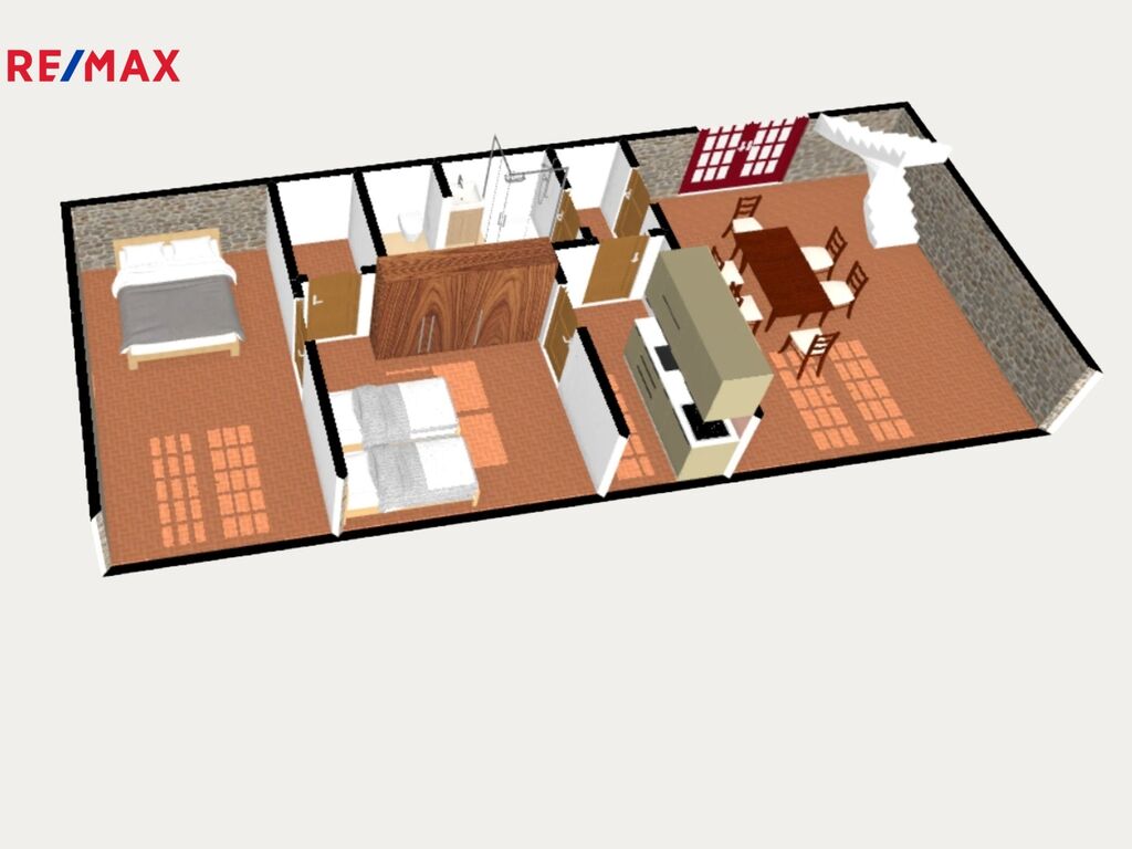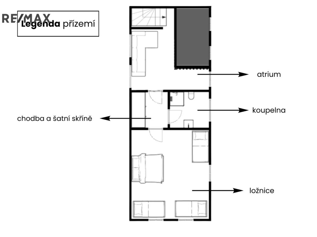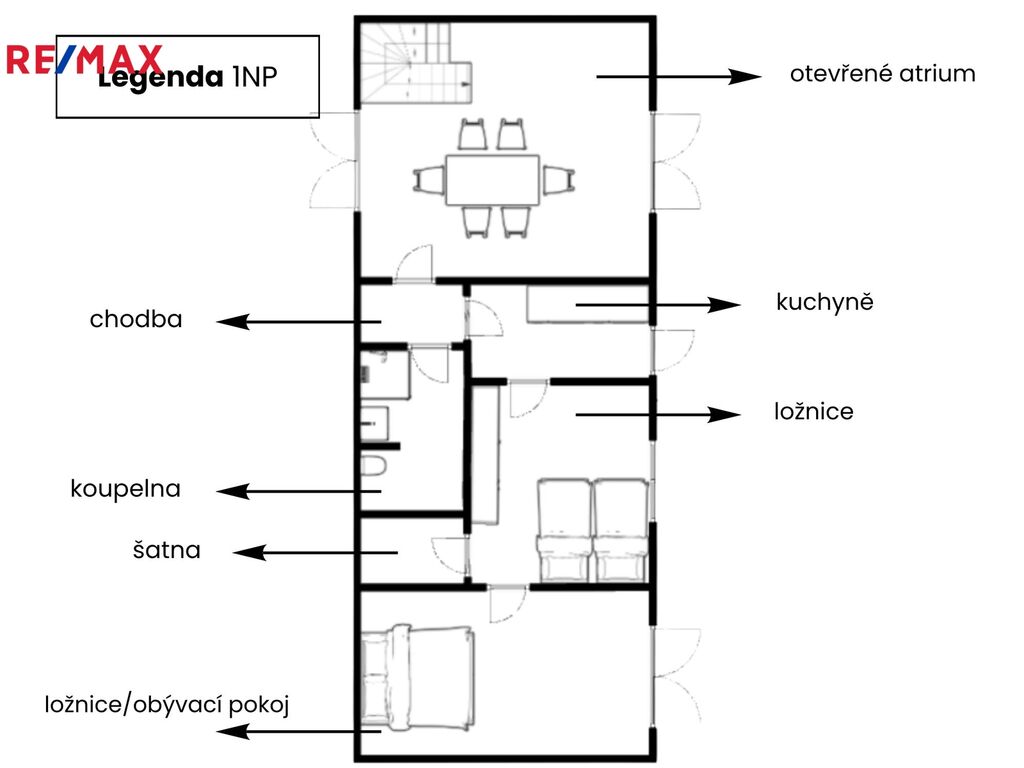 Byt má rozlohu 120 m² a je kompletně vybavený včetně spotřebičů i nábytku. V přízemí se nachází průchozí kuchyně (lednice, mrazák, indukční deska, horkovzdušná trouba) s přístupem do zahrady, otevřené atrium, samostatná ložnice, obývací pokoj a koupelna se sprchovým koutem. V patře je další ložnice, druhá koupelna se sprchovým koutem a atrium se sedací soupravou, které lze využít jako druhý obývací pokoj nebo knihovnu.