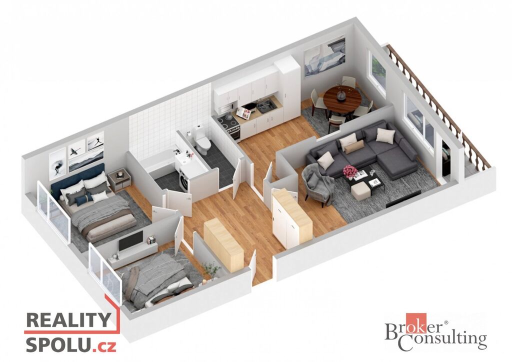 Dominantou je prostorný obývací pokoj s praktickým průhledem do kuchyně s jídelnou – perfektní pro pohodlné servírování nebo rodinné setkávání. Další dva pokoje lze využít jako ložnici a dětský pokoj či pracovnu. Koupelna a toaleta jsou oddělené, v předsíni se nacházejí skříně, které poskytují dostatek úložného prostoru. Velkou předností je balkon, kde si můžete vychutnat ranní kávu nebo odpolední odpočinek.