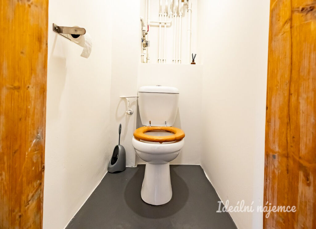 Byt se nabízí nevybavený. Kuchyně disponuje lednicí s mrazákem, elektrickou troubou, plynovým sporákem a pračkou. Obývací část je zařízena TV, taburetem a lampou. Na patře je komoda. V koupelně je sprchový kout, umyvadlo, zrcadlo a koupelnová skříňka. Toaleta je umístěna samostatně.