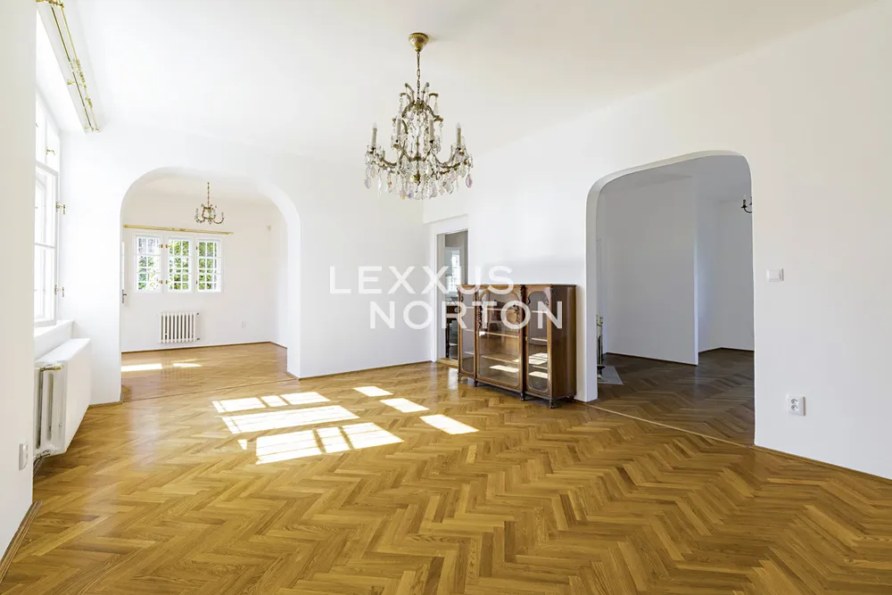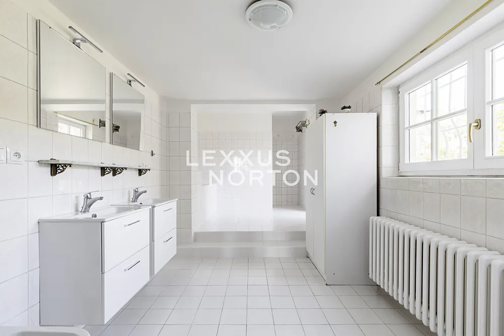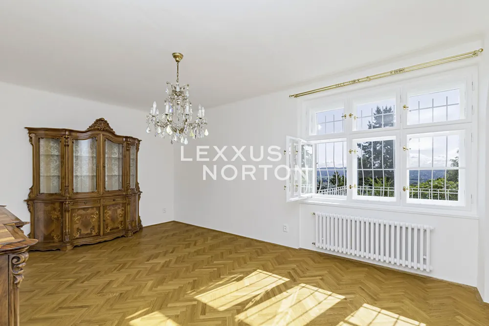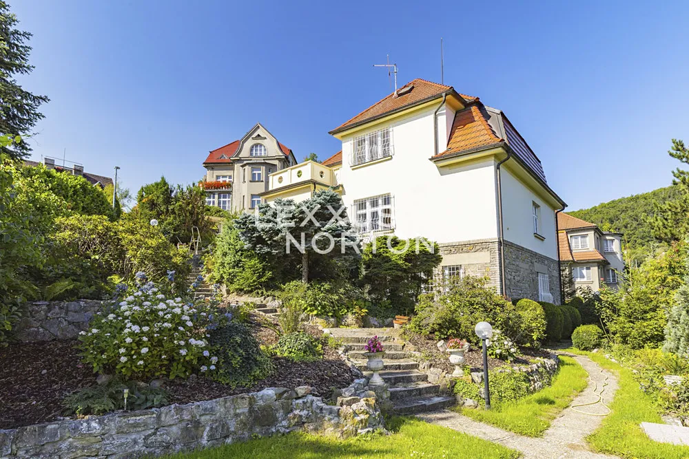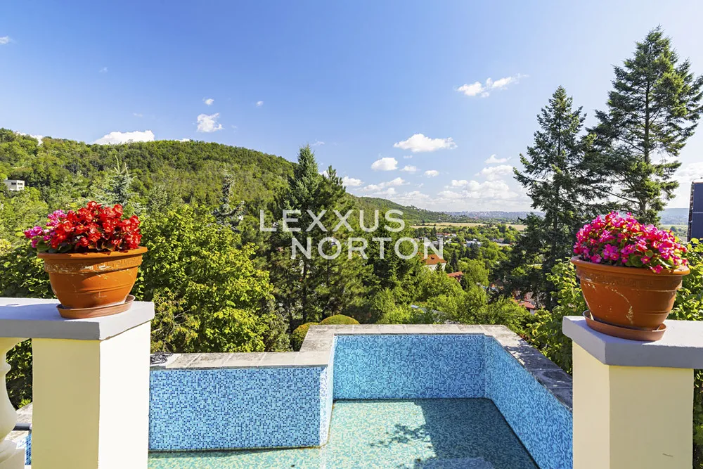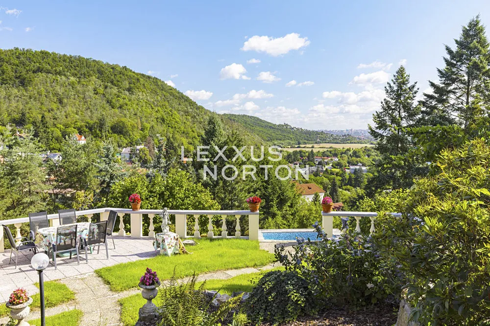 Tato vila je částečně zařízená a v přízemí domu nabízí k užívání vstupní chodbu, jídelní část, prostorný obývací pokoj s krbem, plně vybavenou kuchyň a koupelnu (vana, toaleta, bidet a pračka) s přímým vstupem na terasu a samostatnou toaletu. V 1. patře pak nabízí 1. ložnici s vestavěnou skříní, 2.ložnici s přímým vstupem na terasu a 3. ložnici s šatnou a půdní prostor. V podzemním patře domu naleznete k užívání 2 ložnice, technickou místnost, koupelnu (vana a toaleta), samostatnou toaletu a malou kuchyň s jídelním prostorem s přímým vstupem na zahradu. K domu patří dvojgaráž, zahrada a venkovní bazén s nádherným výhledem na Prahu.