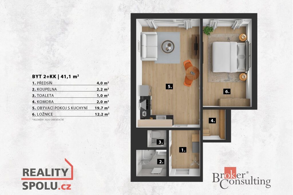 Dispozice 2+kk – prostorný obývací pokoj s kuchyňským koutem, oddělená ložnice, pohodlně navržené pro každodenní život.