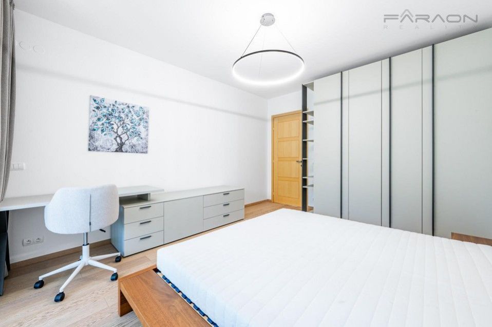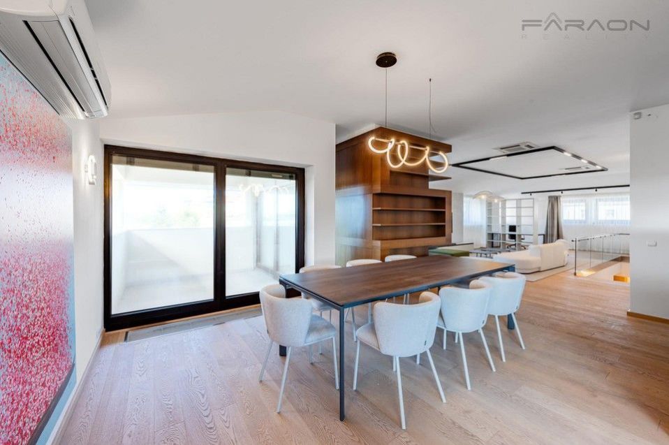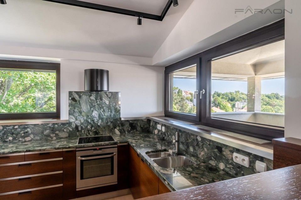 Pronájem reprezentativního a mimořádně prostorného mezonetového bytu 4+kk (206 m2) se třemi terasami (22 m2), ze kterých je neopakovatelný výhled na Prahu, s garážovým stáním a sklepem v atraktivní a velmi klidné lokalitě na Královských Vinohradech. Celý byt se pronajímá kompletně zařízený a vybavený nábytkem na míru, viz. fotodokumentace. V rezidenčním domě je pouze 8 bytů, což zaručuje dostatek soukromí. V horním patře klimatizace, předokenní žaluzie.
