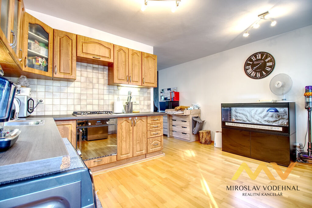 Kuchyňská linka je vybavena elektrickým sporákem, plynovou varnou deskou a místem pro pračku. Bytové jádro je zděné, okna plastová se žaluziemi, podlahy plovoucí. V bytě je zaveden internet. Dům prošel kompletní revitalizací – zateplení, nová fasáda, nové rozvody (stoupačky) a centrální dálkové vytápění z Opatovic s vlastním měřením spotřeby.
