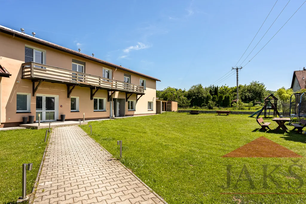 Apartmán/byt č. 2 o dispozici 2+kk s terasou, skladem a parkovacím místem na oploceném pozemku s komunitní zahradou se skleníkem, trampolínou a posezením.