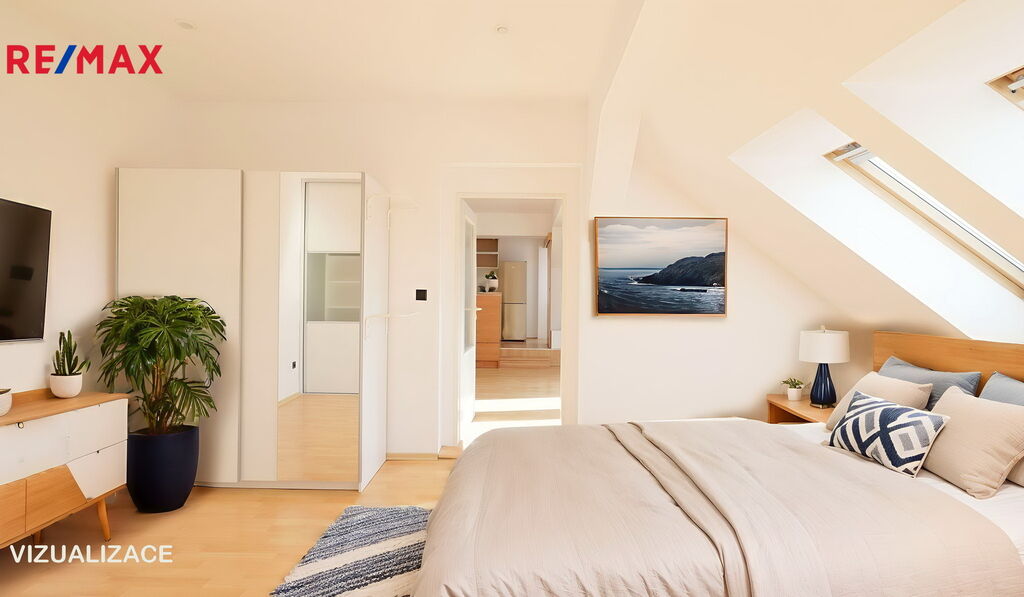 Vstupní chodba do bytu s extra úložným prostorem v podhledu vede do obývací místnosti s kuchyňským koutem. Kychyňský kout stojící na vyvýšeném pódiu je vybavený vestavnou troubou, plynovým sporákem, digestoří a myčkou značky Whirpool. Ostrůvek slouží nejen jako další pracovní plocha, ale je také vybaven oboustranným úložným prostorem se šuplíky. V rohu vedle linky je navíc praktická komora-špajz. Posezení u okna nabízí další úložné prostory. Z obývacího pokoje se dostaneme do ložnice s vestavnou skříní. Na ložnici navazuje koupelna s vanou, místem pro pračku a plynovým kotlem zn. Protherm. Okna v celém bytě směřují na západ.