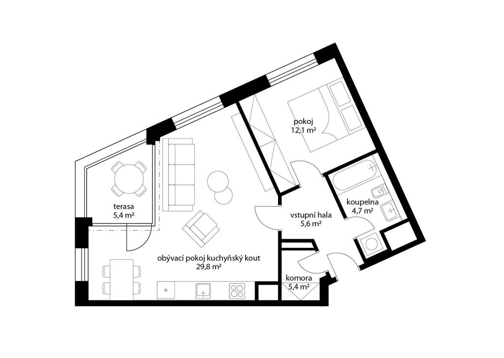 Obývací pokoj s plně vybavenou kuchyní, obývací stěnou a vstupem na terasu s pěkným výhledem, ložnice s manželskou postelí a vestavěnými skříněmi, koupelna s vanou a toaletou, komora a vstupní chodba.