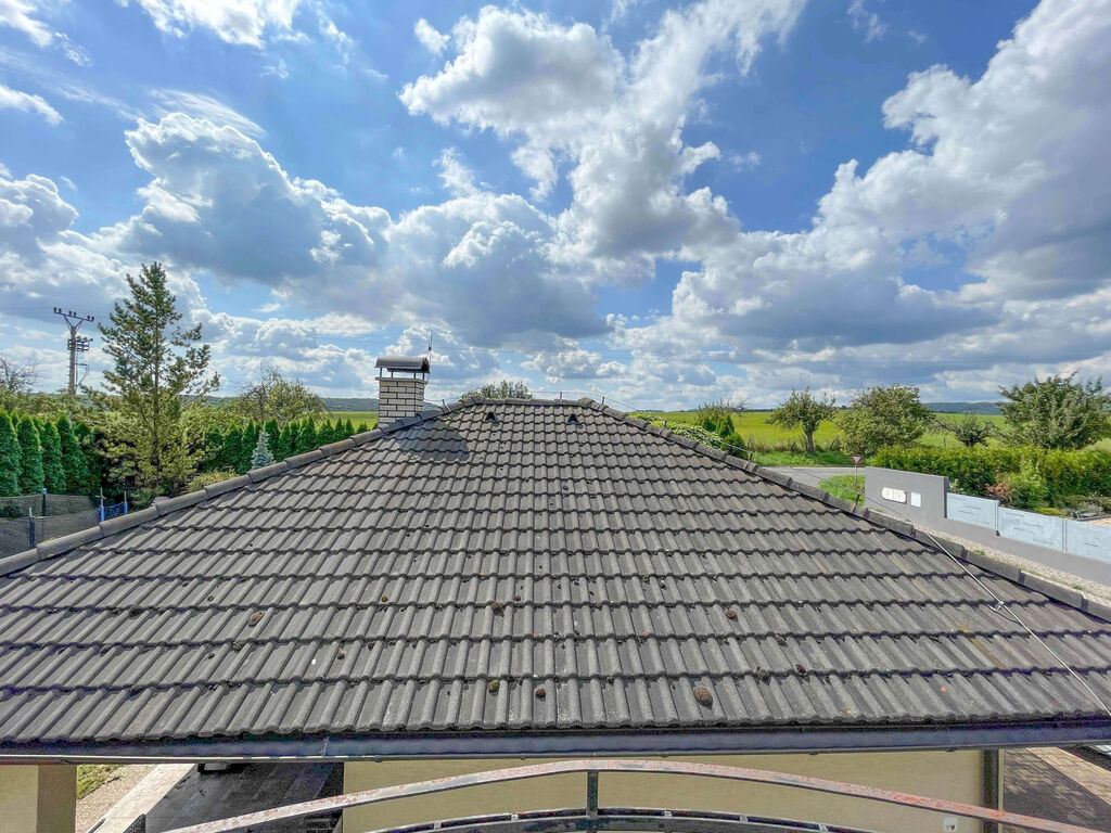• Přízemí: vstupní chodba se šatnou, předsíň s komorou, ložnice pro hosty, pracovna, velkorysý obývací pokoj s krbem, jídelna s plně vybavenou kuchyní Sýkora (AEG), francouzská okna na terasu a zahradu, koupelna s rohovou vanou a WC.