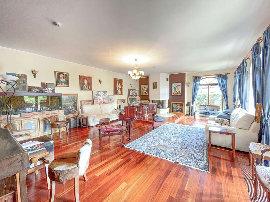 • reprezentativní obývací pokoj ~50 m² s krbem a francouzskými okny na terasu a zahradu