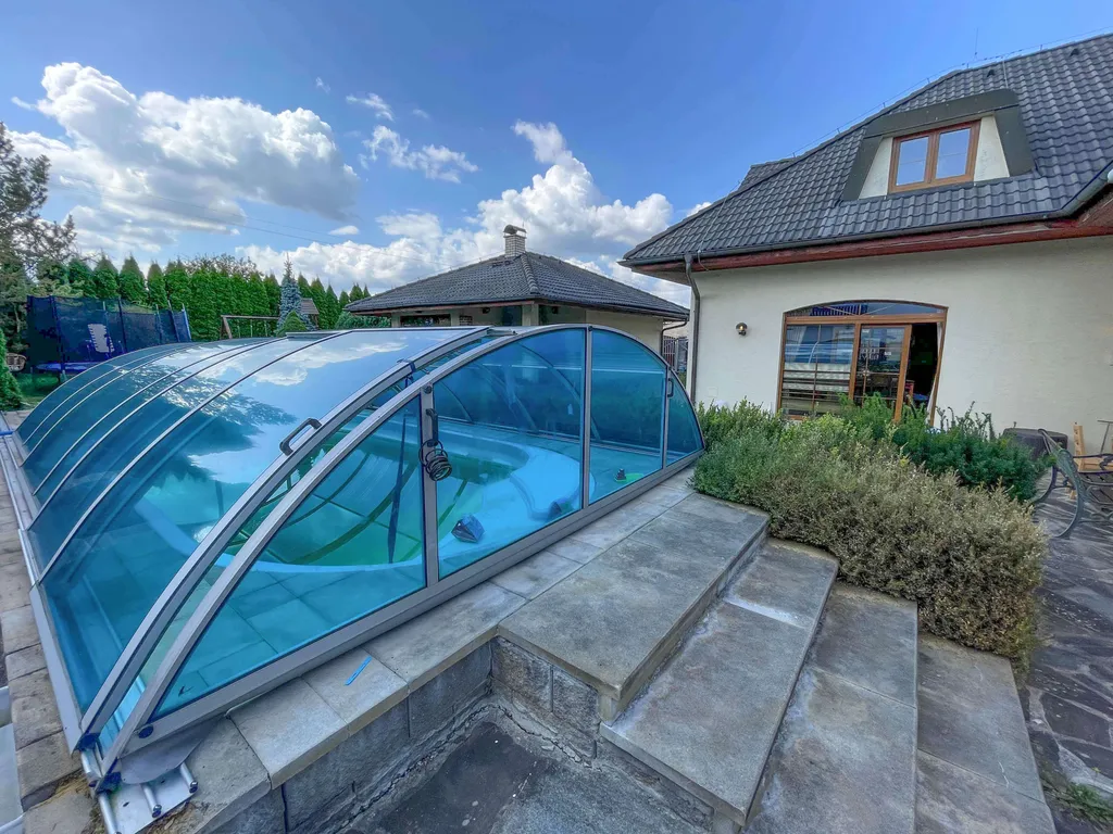 • zastřešená pergola se zahradním krbem, krytý bazén (vyhřívání + protiproud)