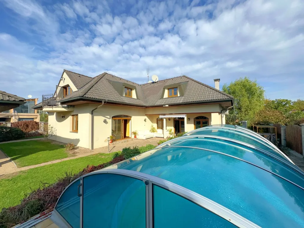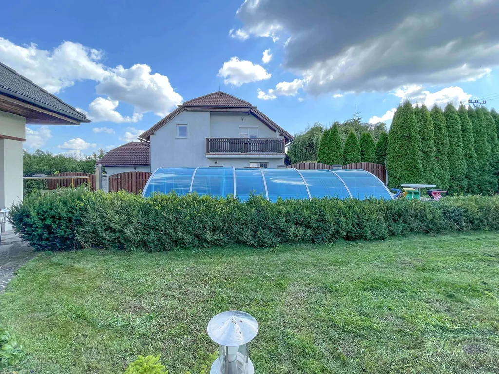 Samostatně stojící dům se vzrostlou zahradou, krytým bazénem s protiproudem a saunou v obci Klínec u Prahy.